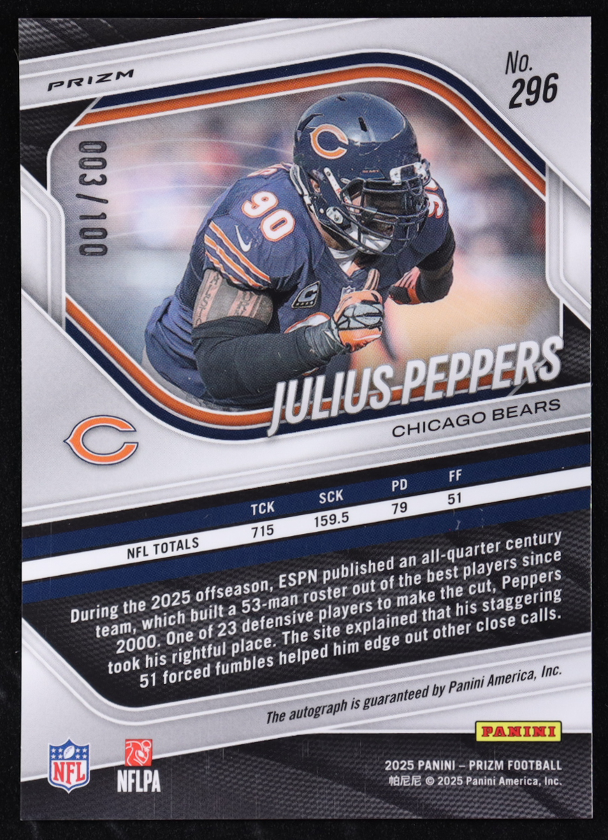 Julius Peppers 2025 Panini Prizm Autographs Prizms Choice #296 #003/100