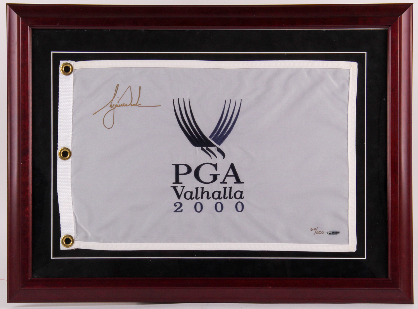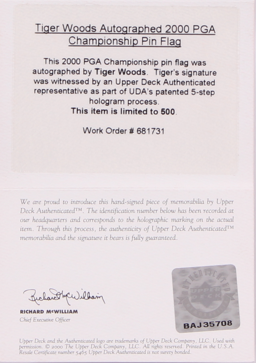 Custom Framed 2000 PGA Championship pin flag measures 21" x 28" in size. Hand-signed in gold paint pen by Tiger Woods. The flag is limited edition and has been hand-numbered #54/500.