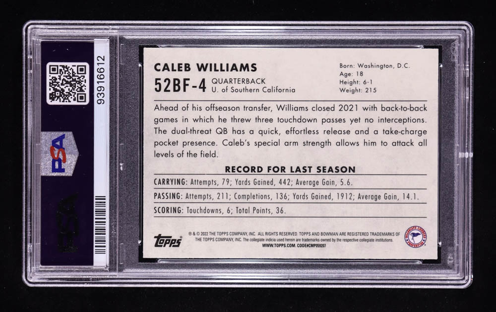 Caleb Williams 2022 Bowman Chrome University '52 Bowman #52BF4 RC (PSA 10)