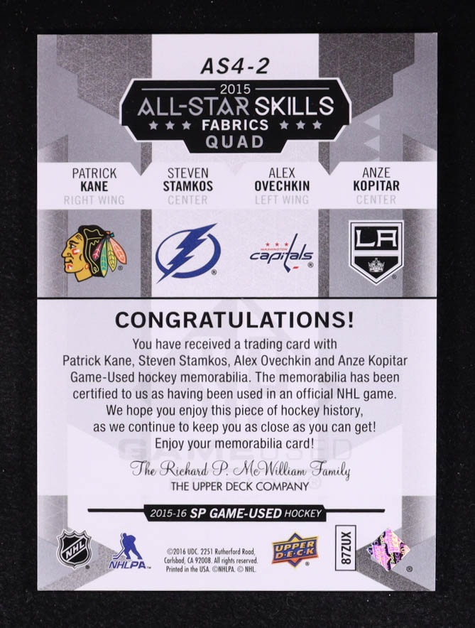 Patrick Kane / Steven Stamkos / Alexander Ovechkin / Anze Kopitar 2015-16 SP Game Used All-Star Skills Quad Fabrics #AS42