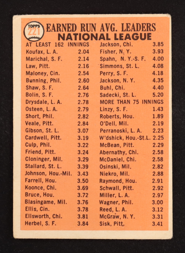 Sandy Koufax / Juan Marichal / Vern Law 1966 Topps #221 / NL ERA Leaders