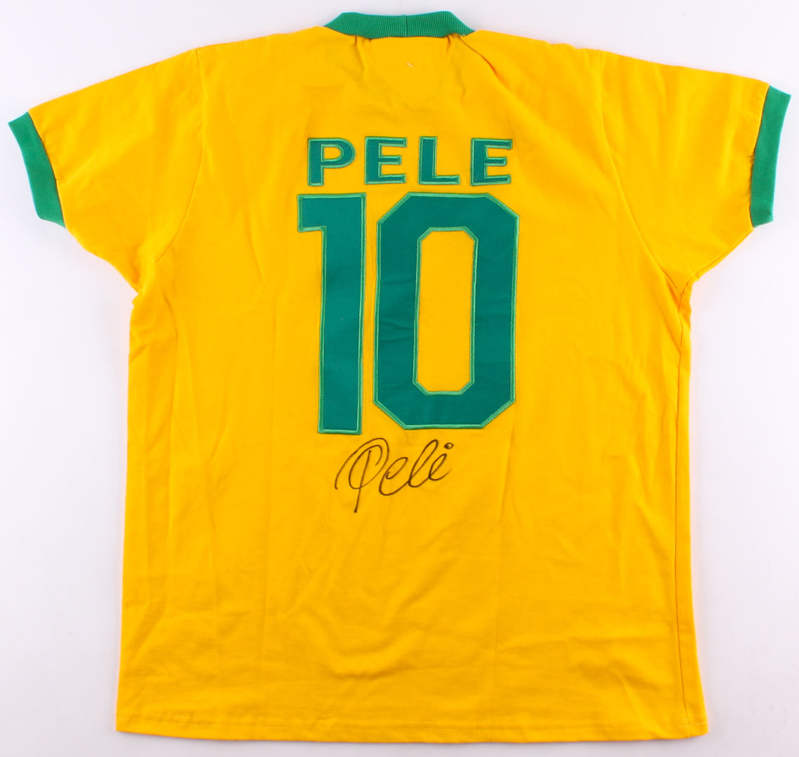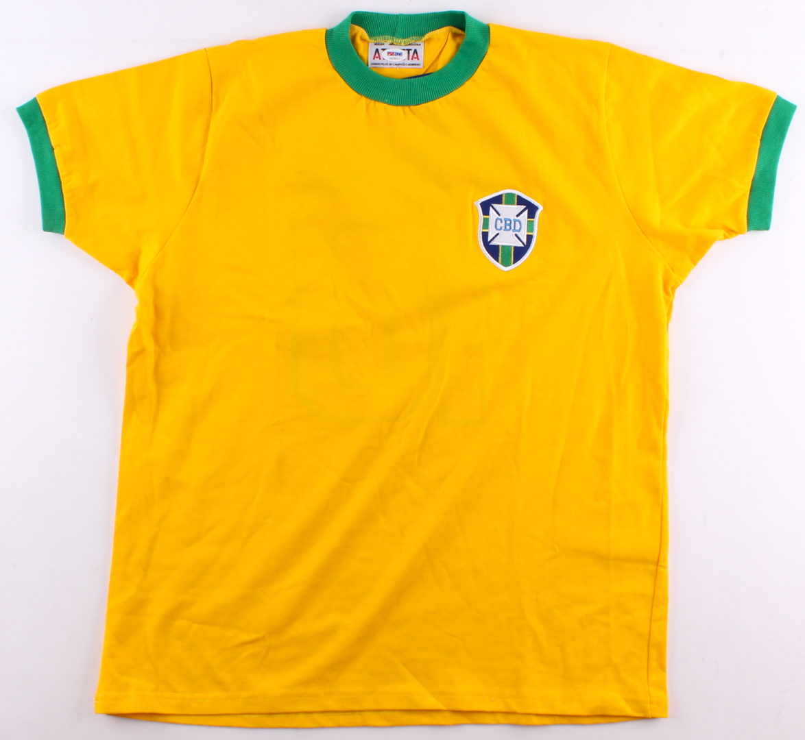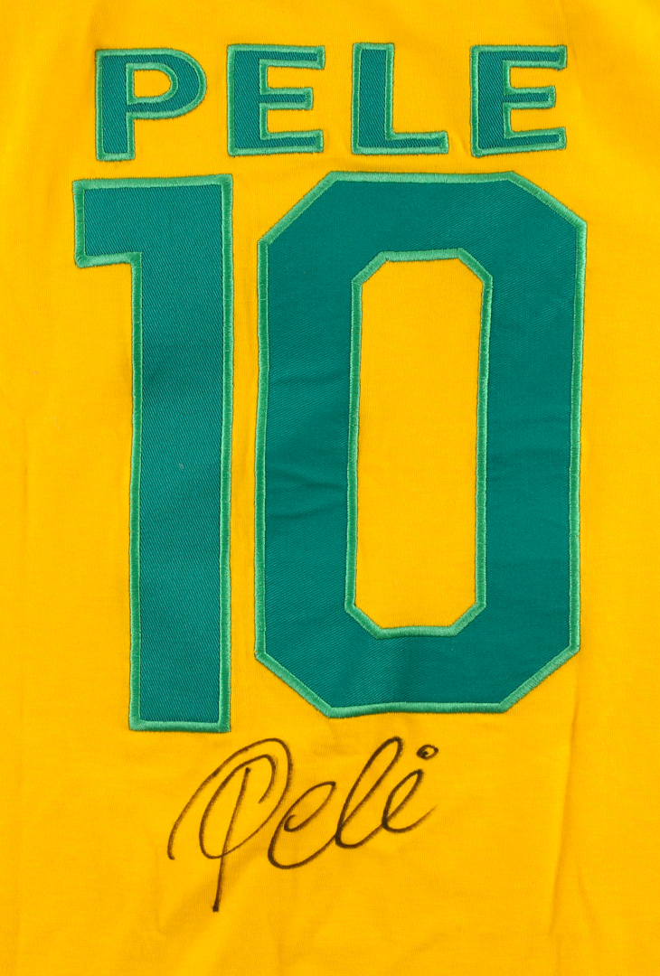 Team Brazil Pele jersey T-shirt. Everything is sewn on. Hand-signed in black felt-tip pen by Pele.