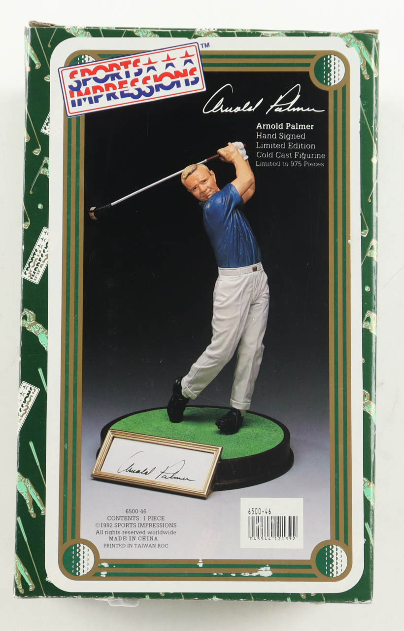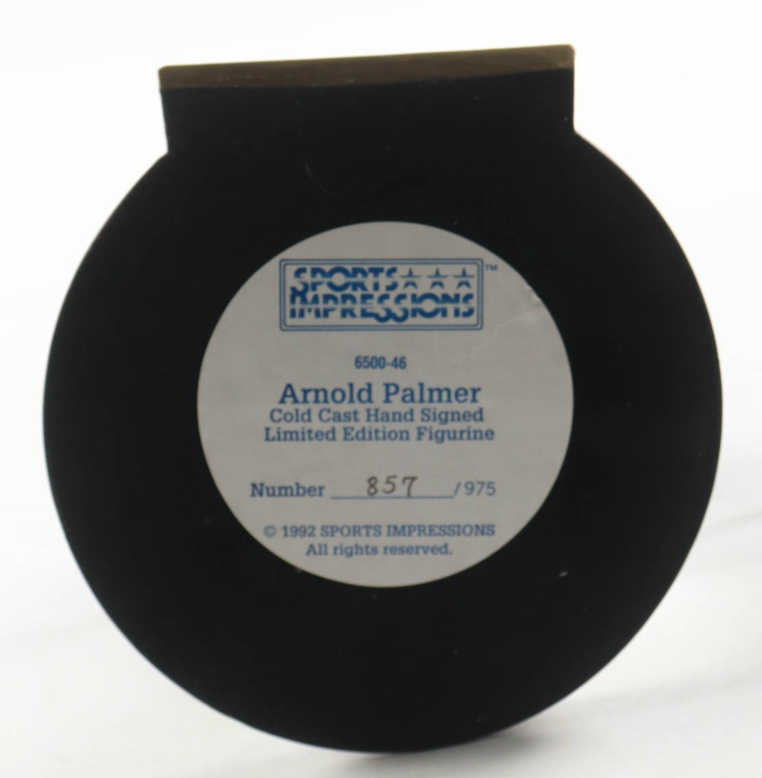 Sports Impressions figure measures approximately 9" in height. Hand-signed by Arnold Palmer (D. 2016, HOF). Limited edition #857/975. The golf club is detached.