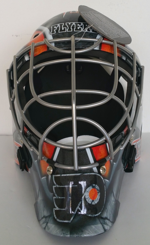 Flyers Full Size Goalie Mask has been hand-signed in silver paint pen by Ron Hextall and Bernie Parent (HOF).