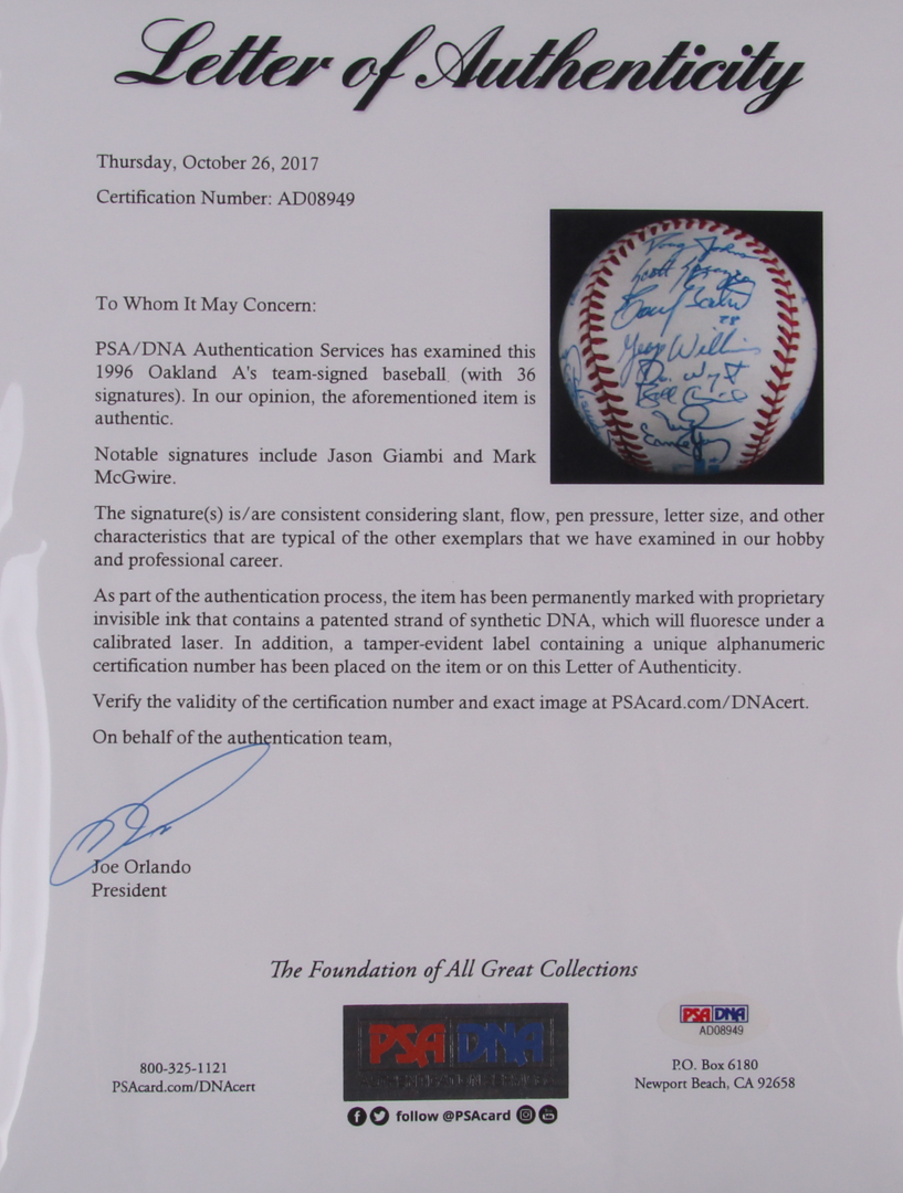 1996 Oakland Athletic's Signed OAL Baseball with (36) Signatures Including Jason Giambi, Mark McGwire, Art Howe Inscirbed "A's 96" (JSA LOA)