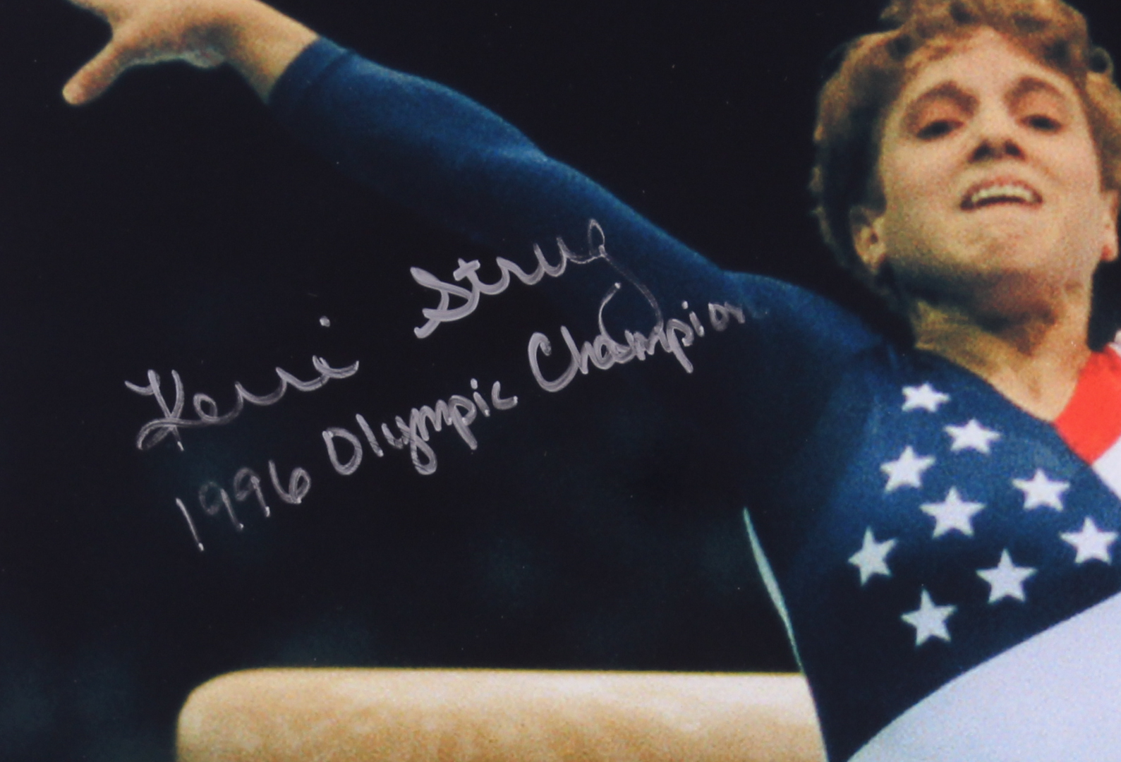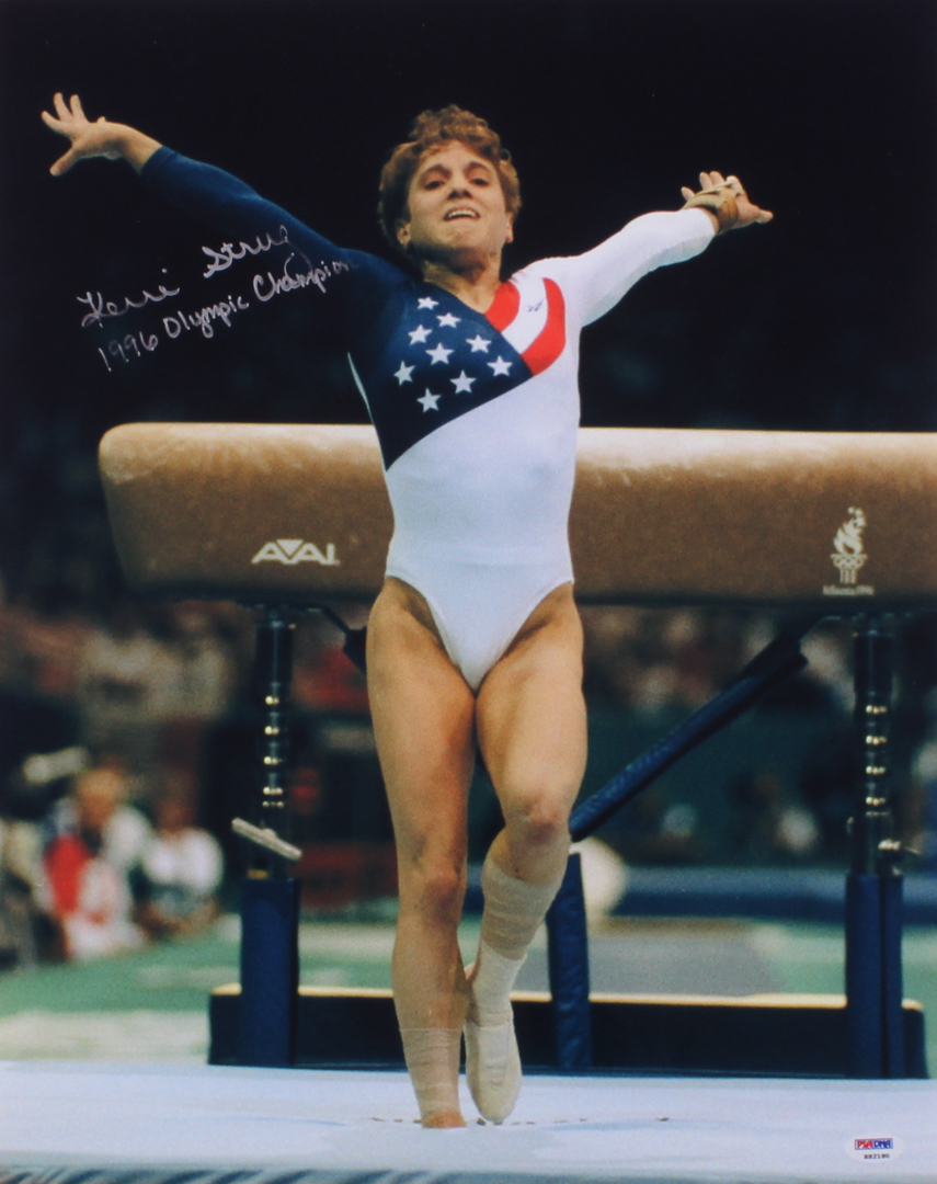 Photo measures 16" x 20" in size and has been hand-signed in silver paint pen by Kerri Strug (USA).