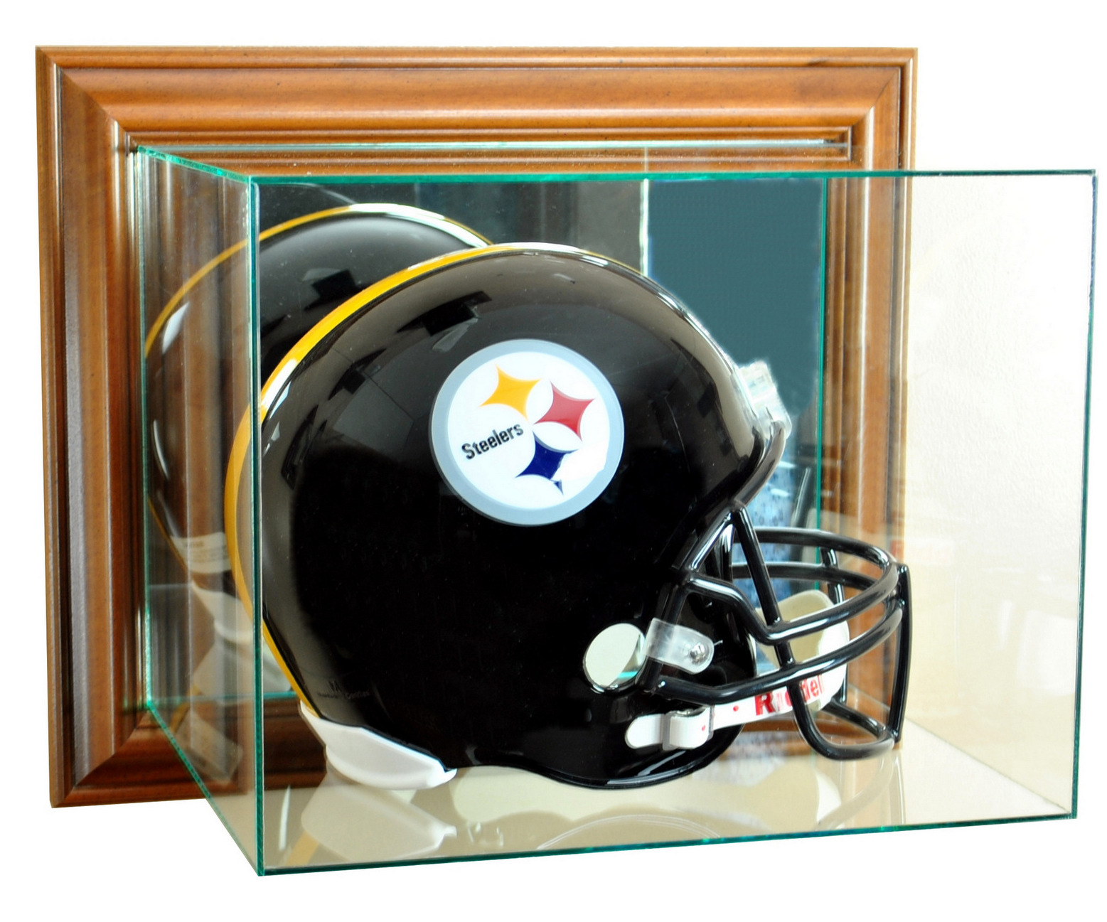 Wall Mounted Full-Size Football Helmet Display Case with Mirrored Back & Walnut Wood Frame