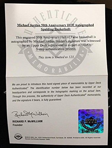 Counting his field goals, free throws and three-pointers during regular season play, NBA All-Star and playoff performer Michael Jordan put the ball in the basket an incredible 23,319 times during his NBA career. Many of those scores came in pressure packed situations, making M.J. one of the game's best closers. Retain your favorite memories of a 10-time NBA scoring leader with this Michael Jordan signed Spalding 50th Anniversary HOF logo leather basketball. The item is authenticated by virtue of Upper Deck Authenticated's 5-Step process. This ball is part of a limited edition 123. You will receive a random number from the edition. Includes certificate of authenticity and hologram! Jordan's signature is guaranteed authentic through the Upper Deck Authenticated serial numbered hologram system.