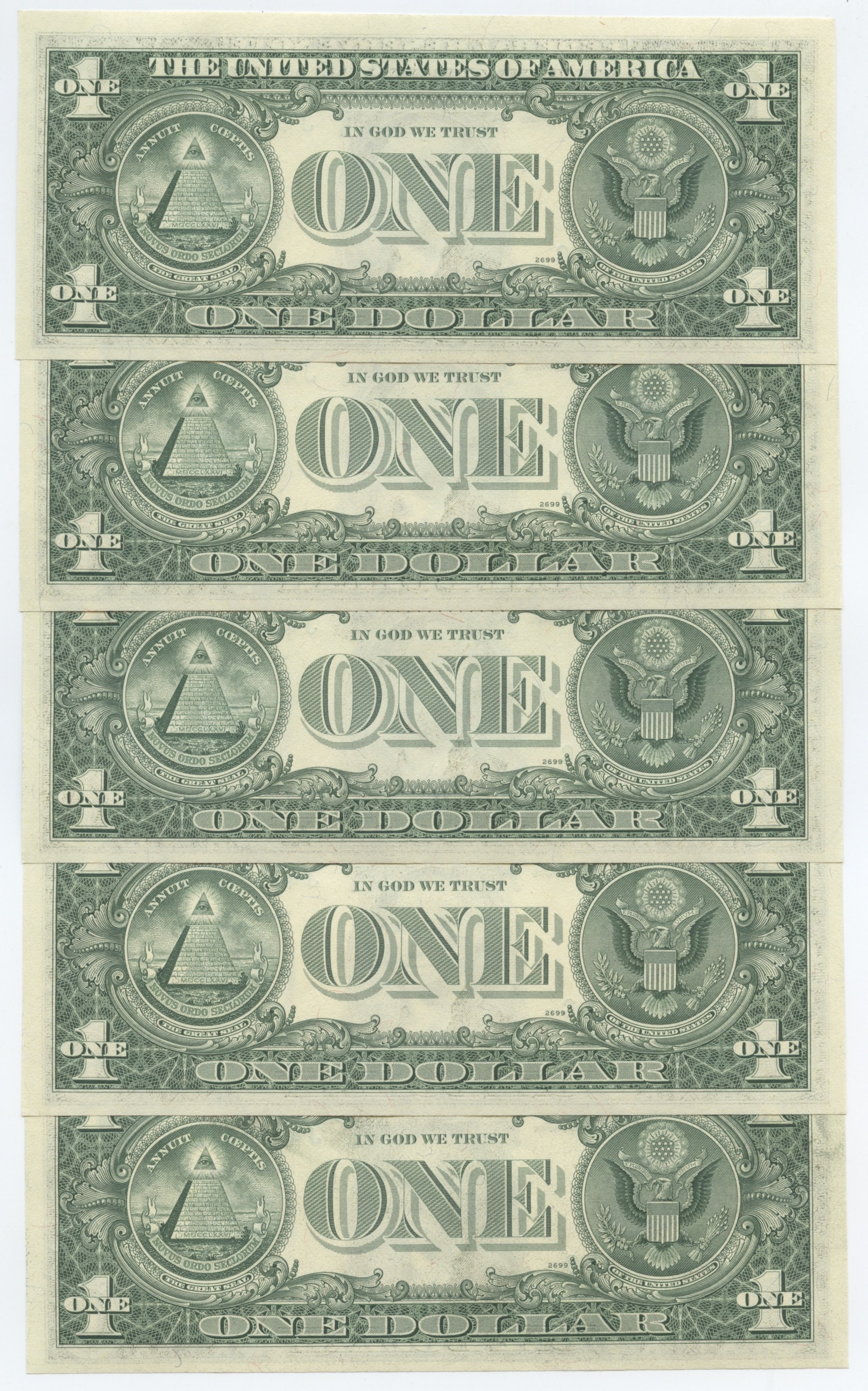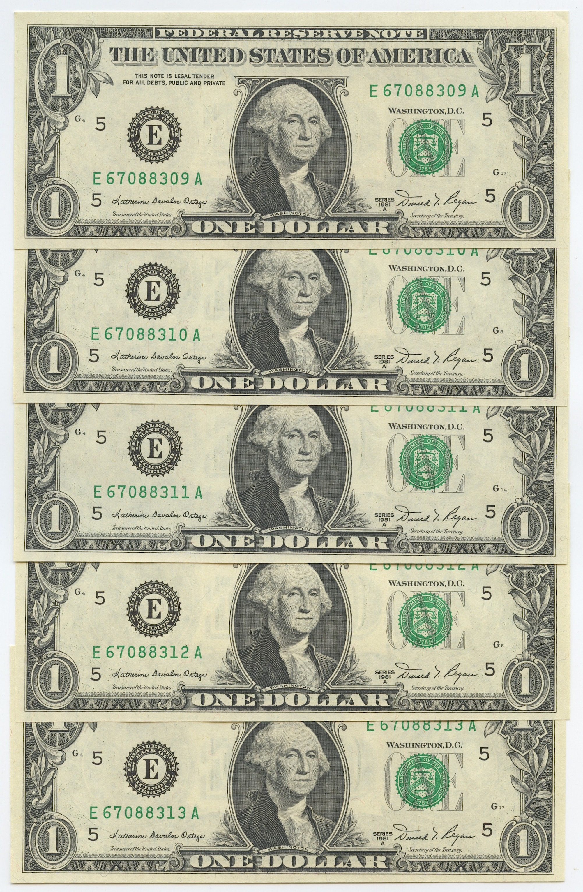 Lot of (5) 1981-A $1 One Dollar Federal Reserve Notes with Consecutive Serial Numbers (Choice Crisp Uncirculated)