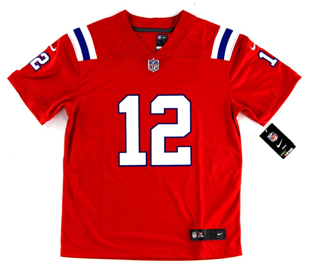 Nike on-field style jersey. Everything is sewn on, size Youth XL. Hand-signed in black felt-tip pen by Tom Brady.