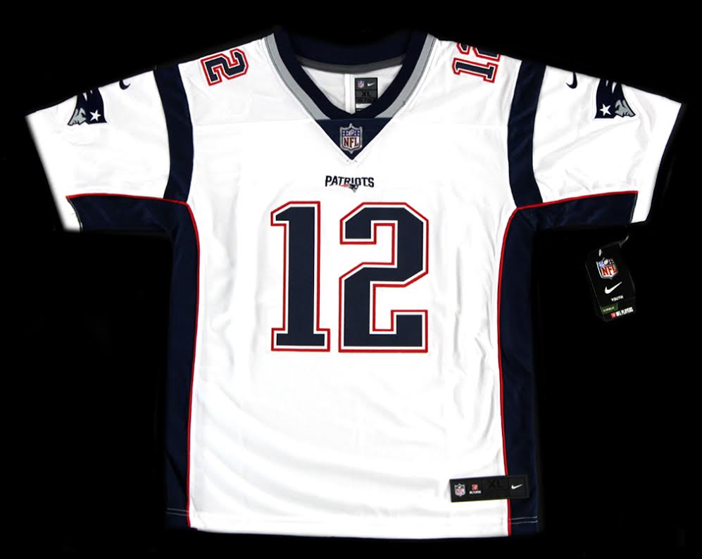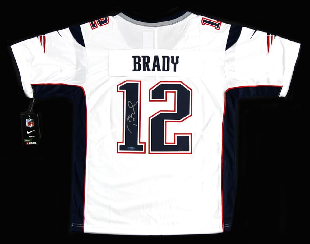 Nike authentic on-field style jersey. Everything is sewn on, size Youth XL. Hand-signed in silver paint pen by Tom Brady.