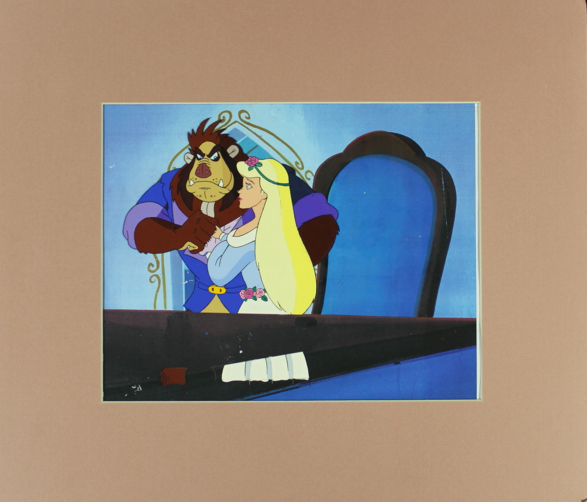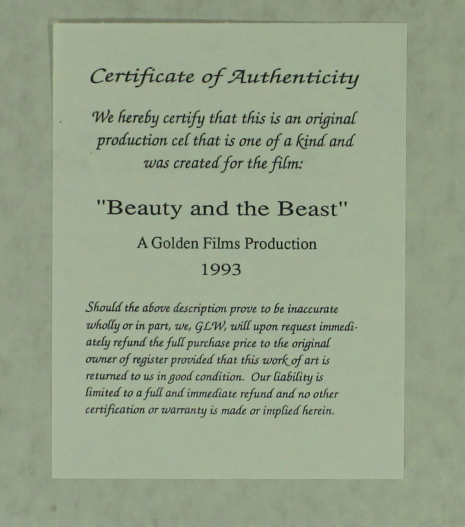 This lot includes an original hand-painted Animation Production Cel used in the production of "Beauty and the Beast" (A Golden Films Production 1993). This is a one-of-a-kind piece. Custom matted to an overall size of 13" x 15". Piece shows some wear on the edges. Includes a COA from Golden Films for authenticity purposes.