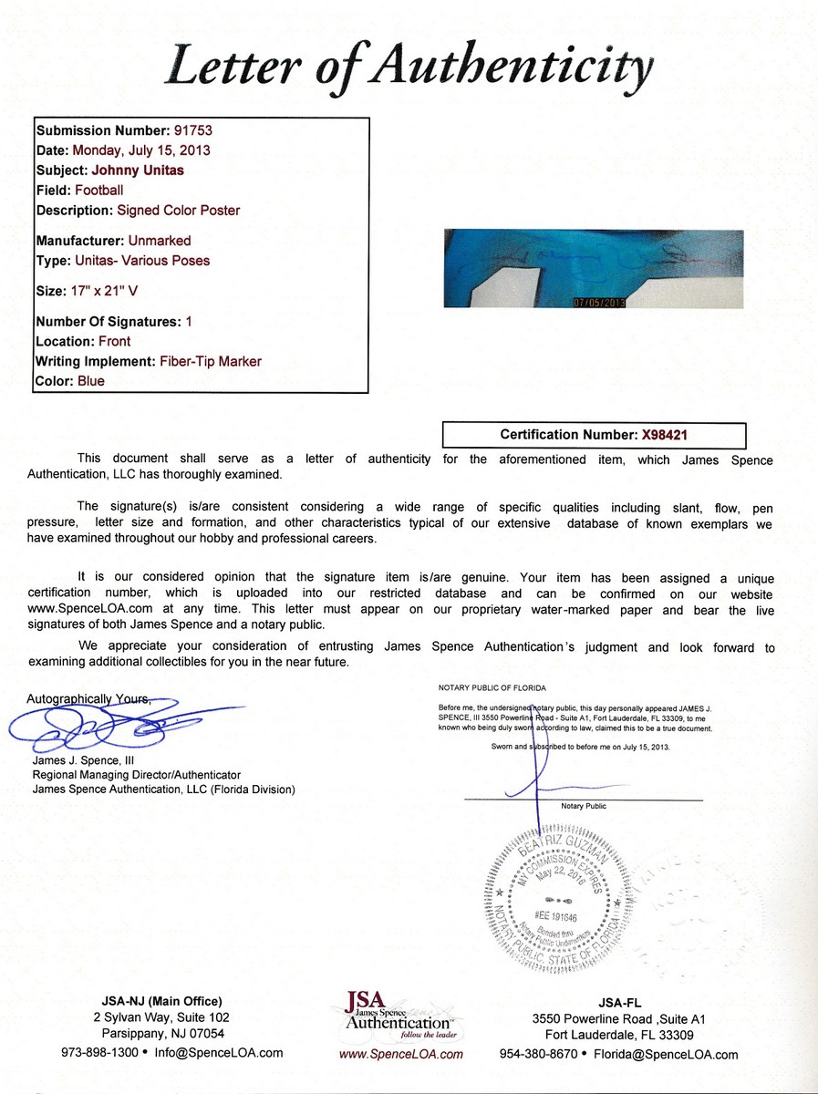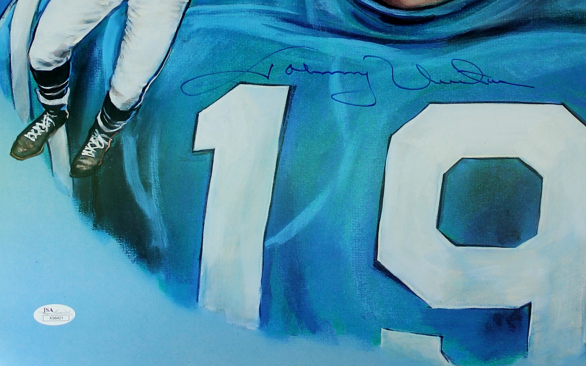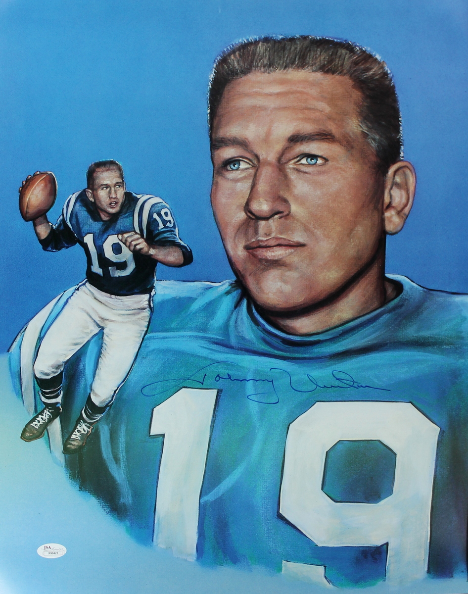Lithograph measures 17" x 21" in size. Lithograph has been hand-signed in blue felt-tip pen by Johnny Unitas (D 2002, Colts HOF). Autograph includes an official James Spence Authentication (JSA) Hologram and matching LOA for authenticity purposes.