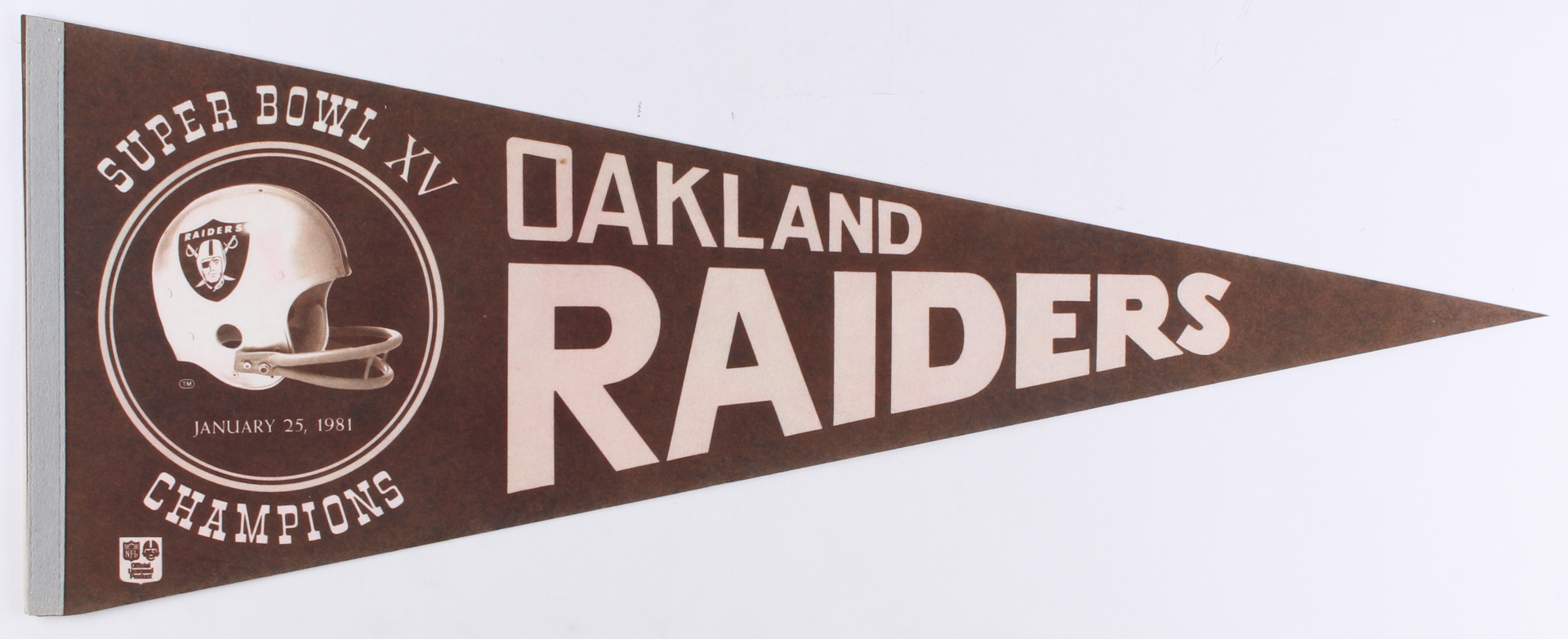 Oakland Raiders Super Bowl XV pennant. Pennant flag measures approximately 29.5" long. Please note, the pennant shows signs of wear.