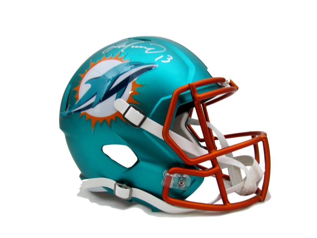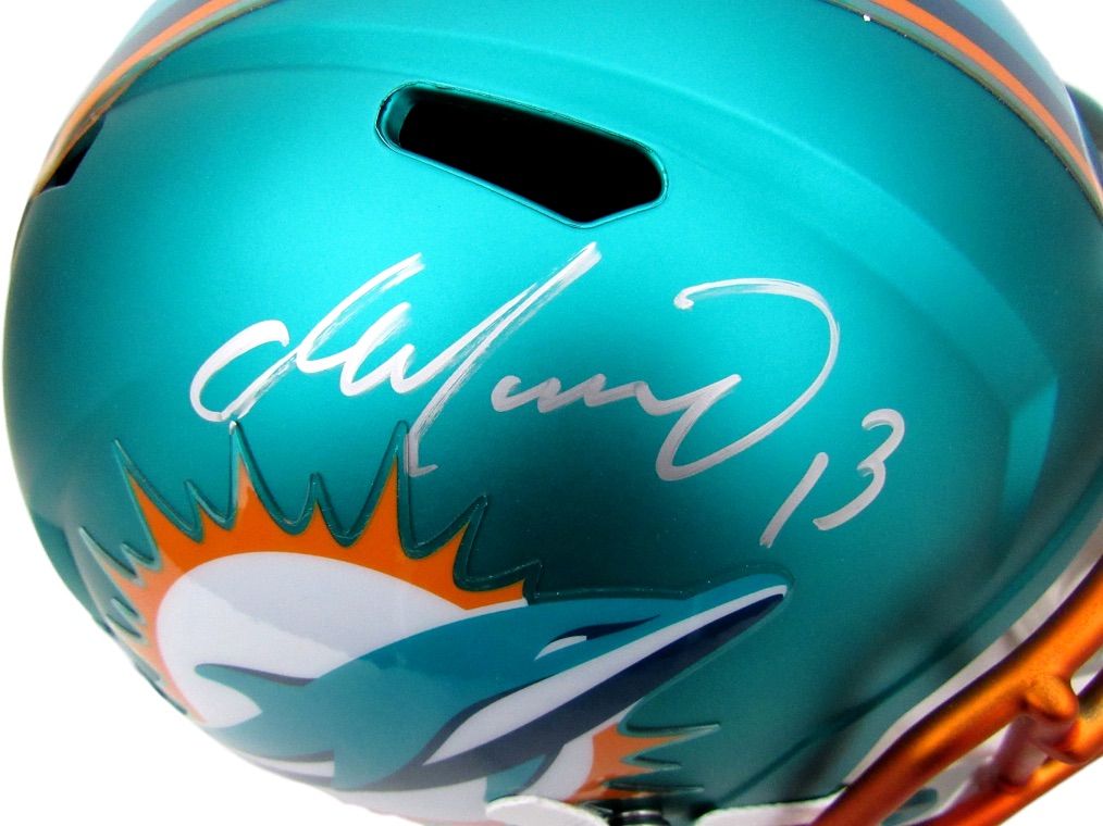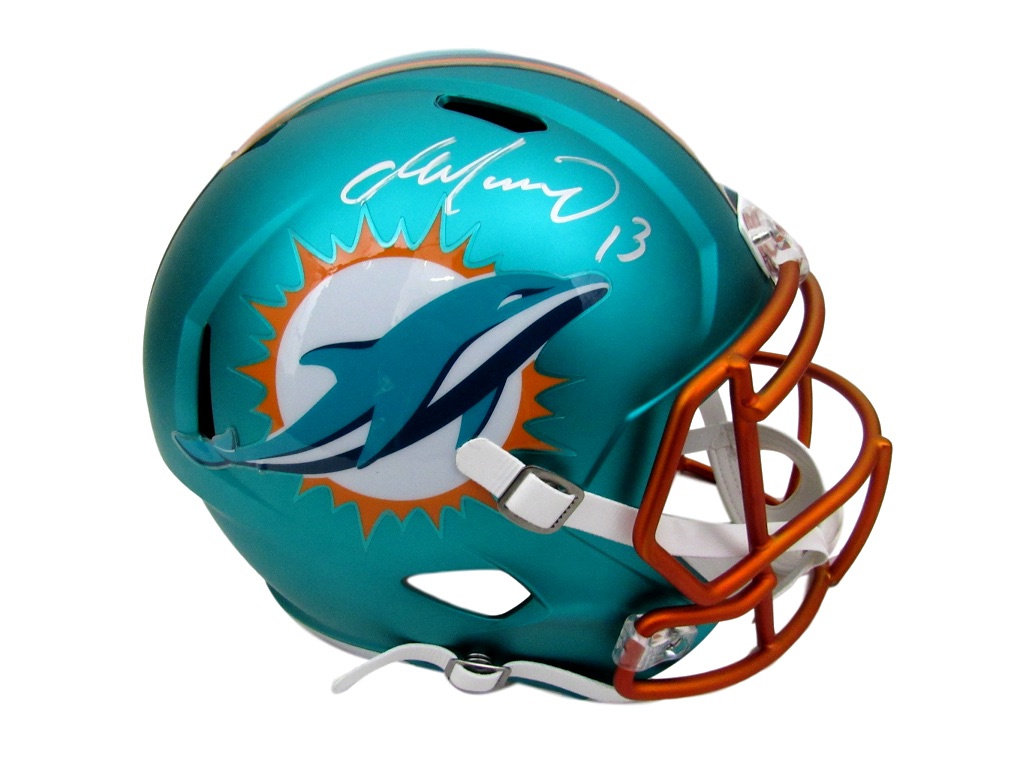 Miami Dolphins full-size speed replica blaze helmet has been hand-signed in silver paint pen by Dan Marino (HOF).