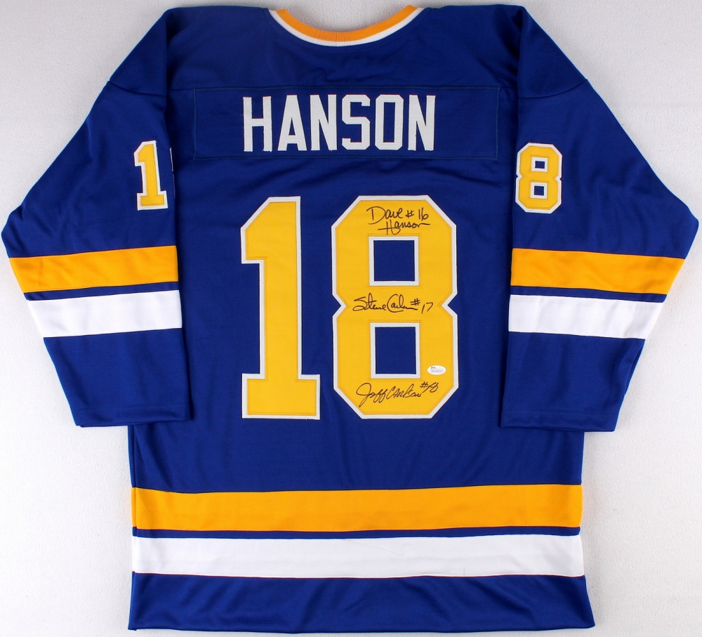 Custom on-ice style jersey. Everything is sewn on, size XL. Hand-signed in black felt-tip pen by Dave Hanson, Steve Carlson, and Jeff Carlson.