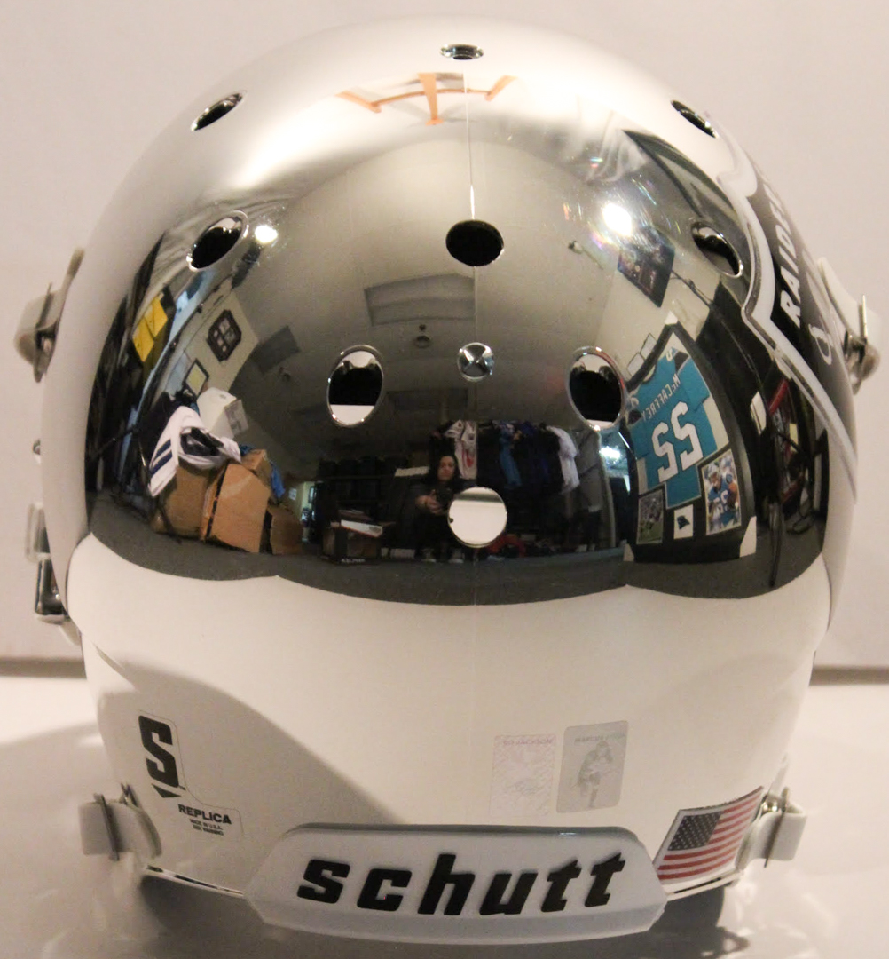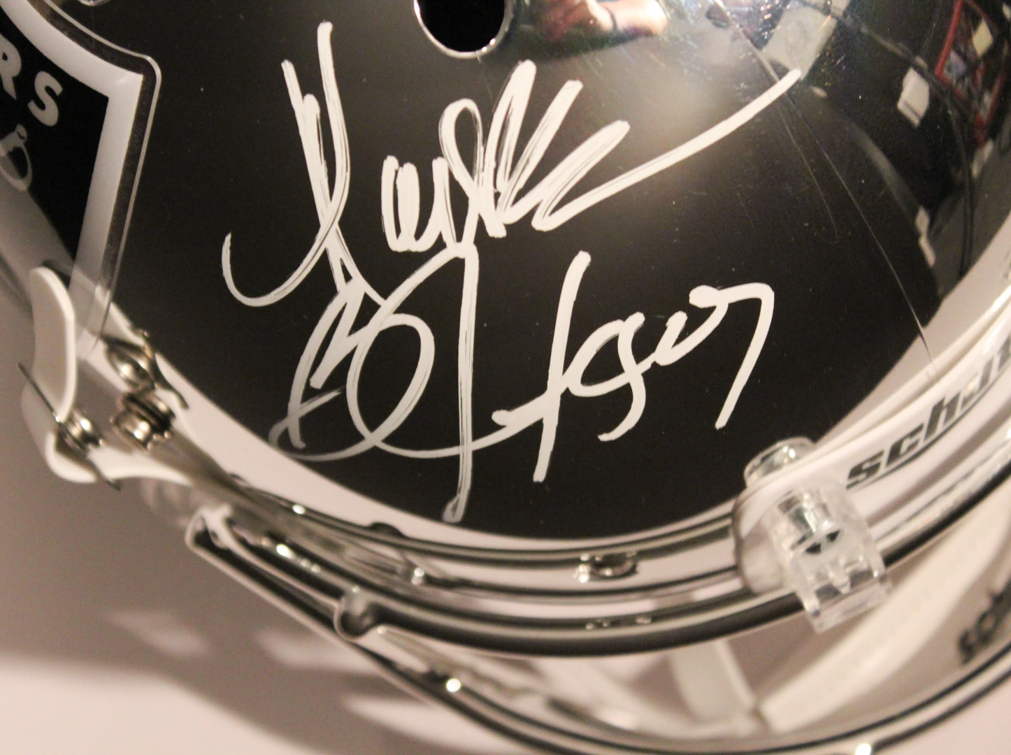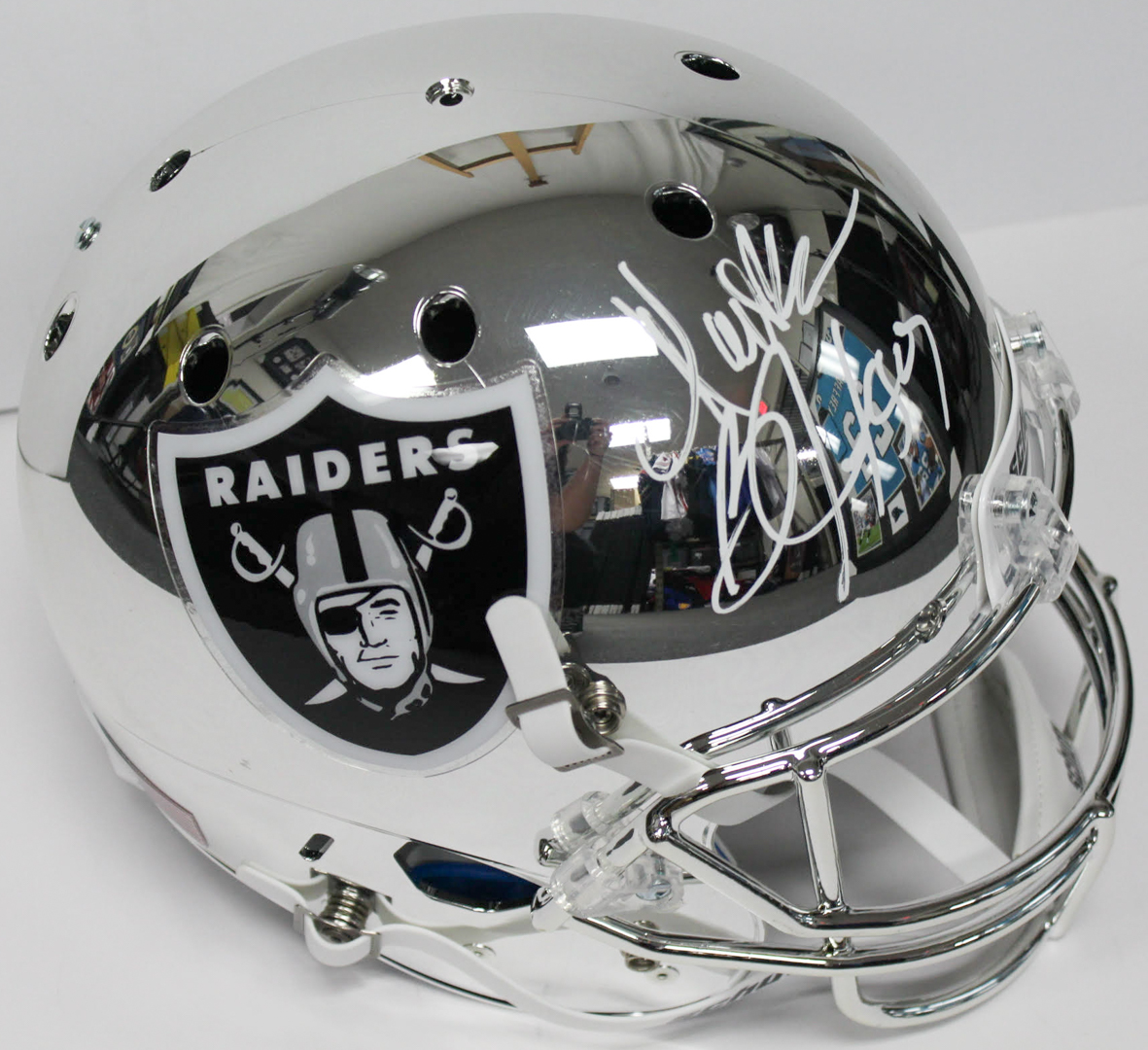 Oakland Raiders full-size chrome replica helmet. Hand-signed in white paint pen by Bo Jackson and Marcus Allen (HOF).