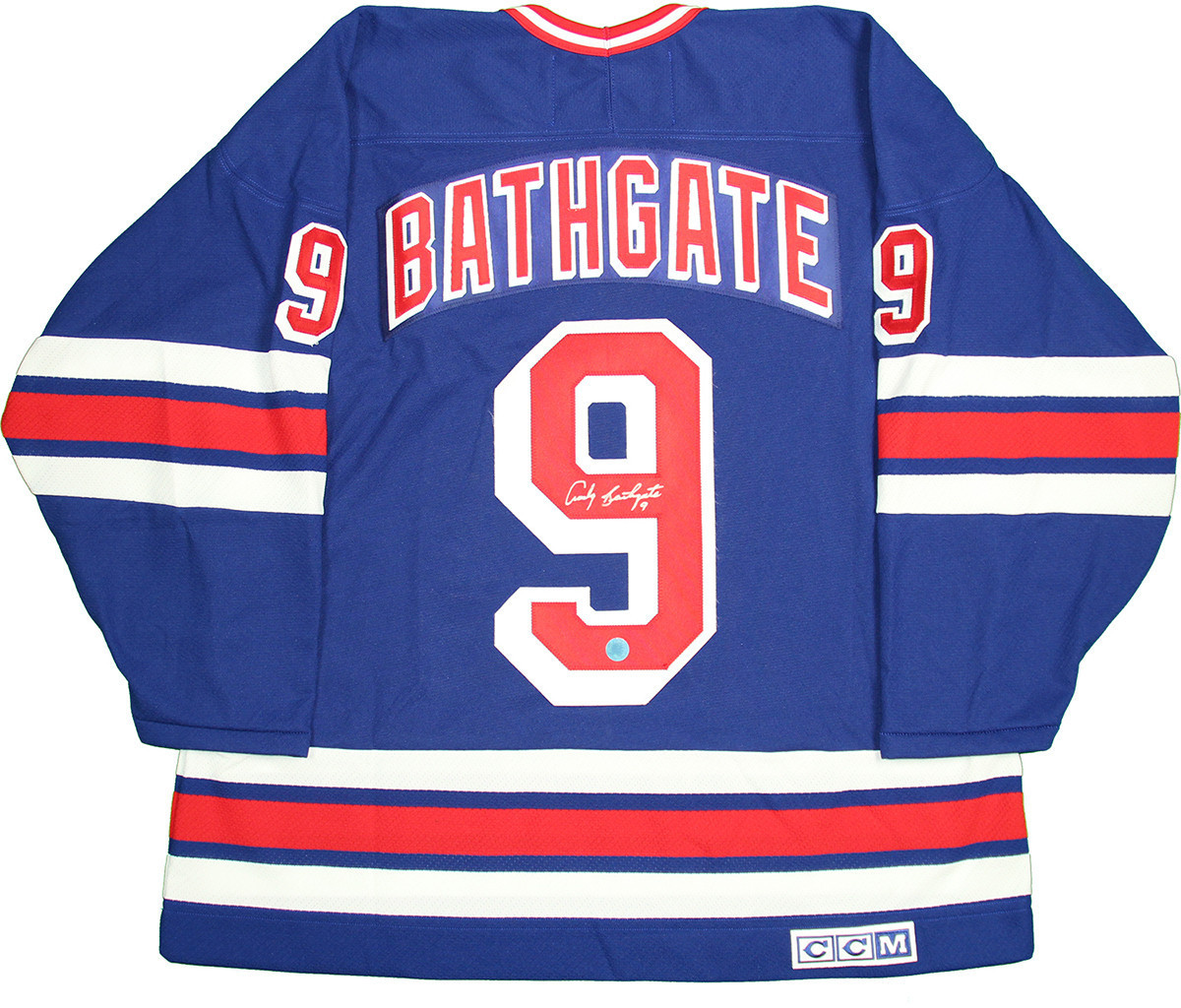 CCM on-ice style jersey. Hand-signed in silver paint pen by Andy Bathgate (HOF).