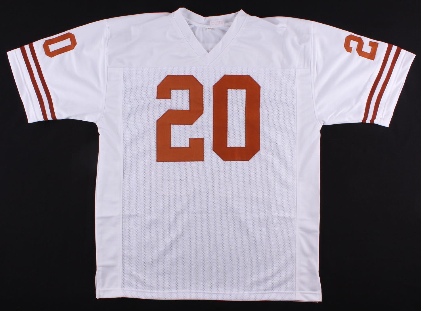 Custom on field style jersey. Everything sewn on, size XL. Hand signed in black felt-tip pen by Earl Campbell (HOF).