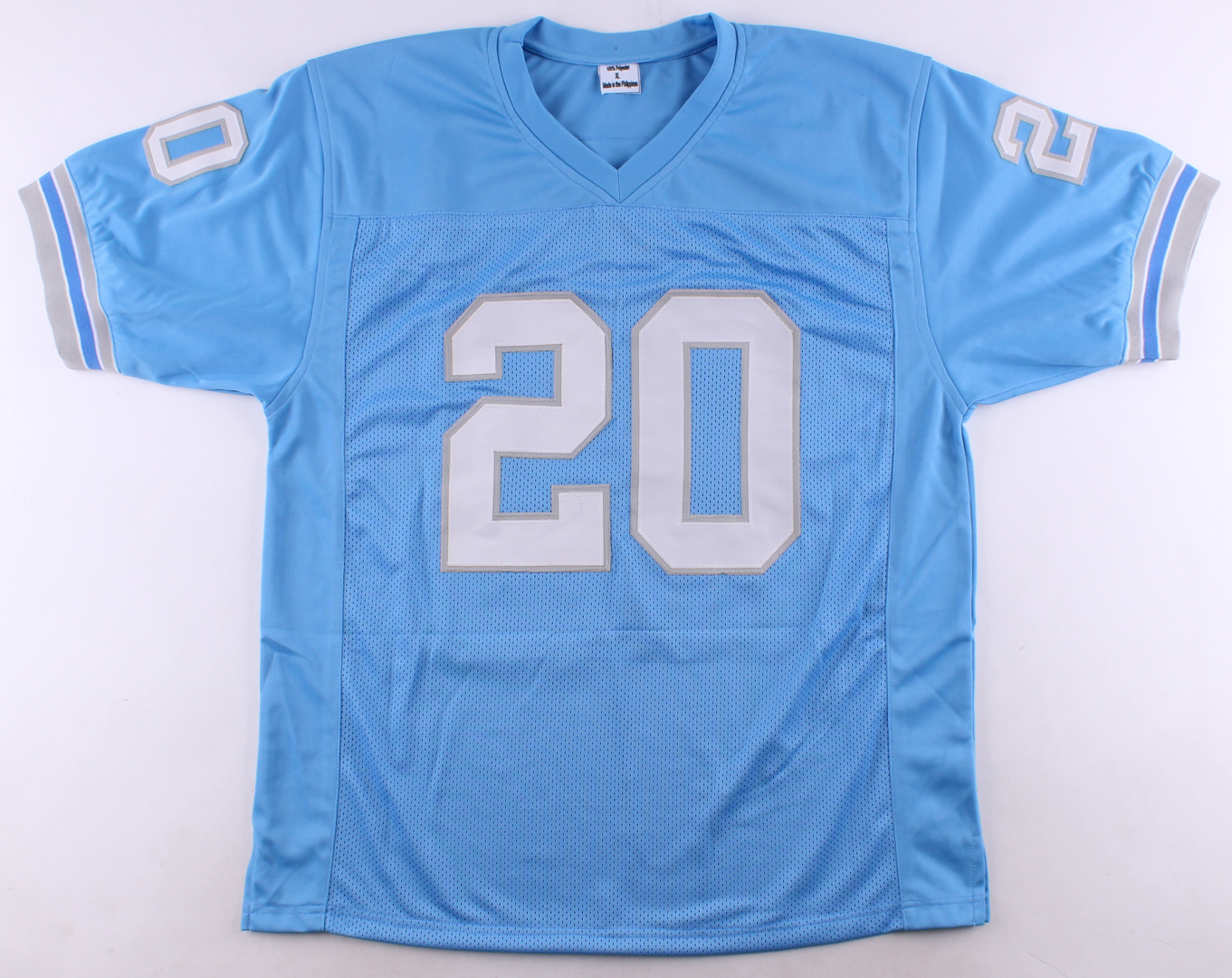 Custom on-field style jersey. Everything is sewn on, size XL. Hand-signed in black felt-tip pen by Barry Sanders (HOF).