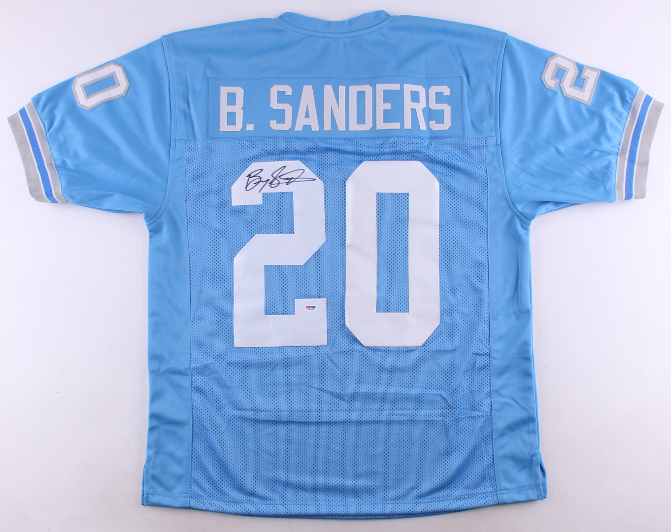 Custom on-field style jersey. Everything is sewn on, size XL. Hand-signed in black felt-tip pen by Barry Sanders (HOF).