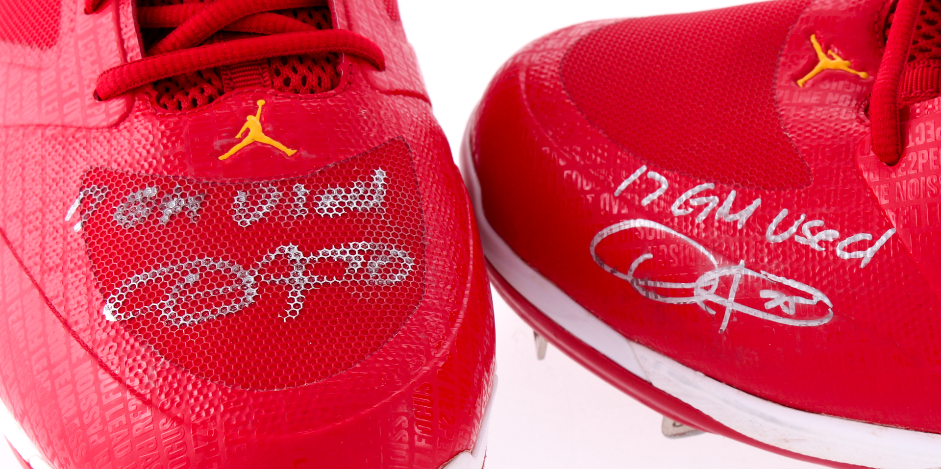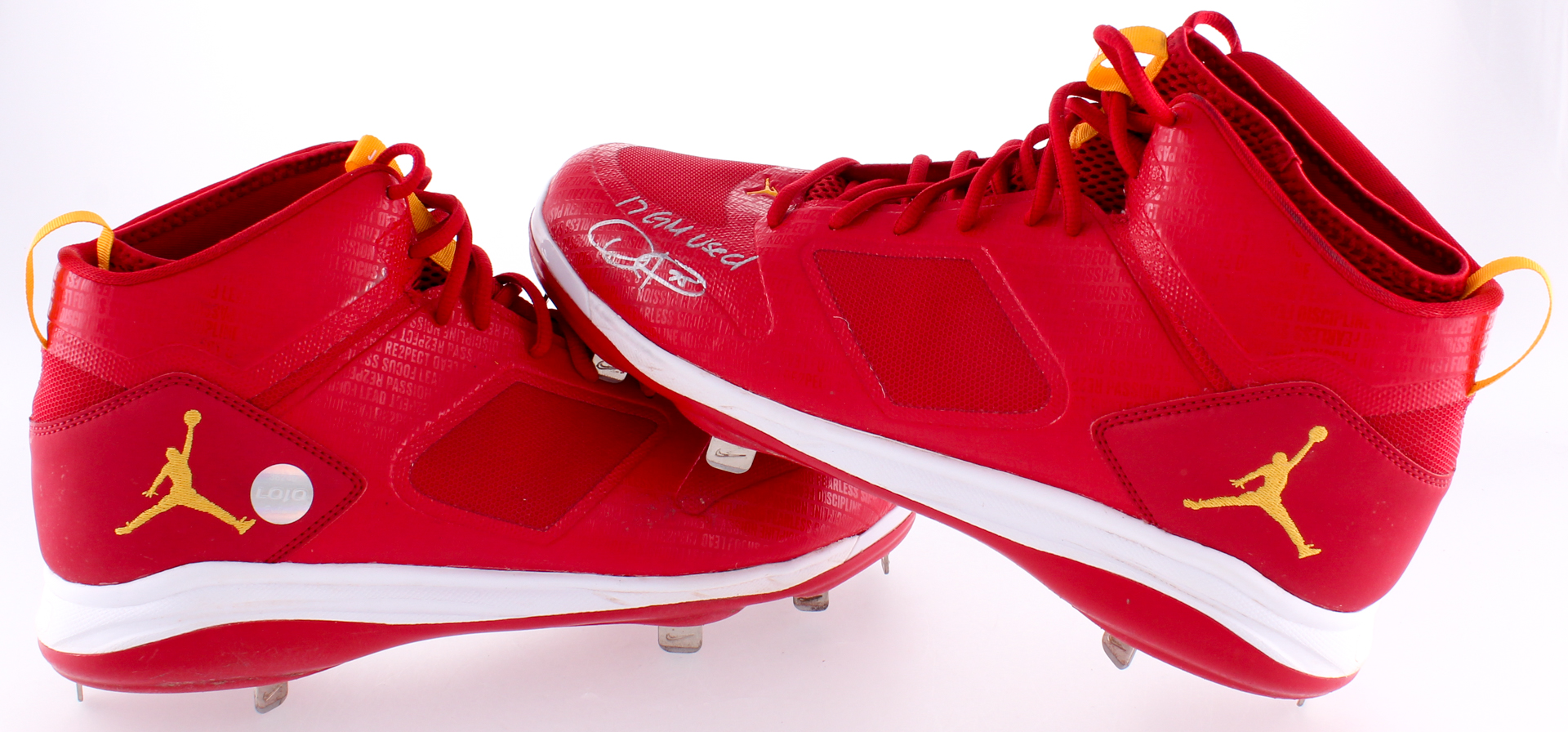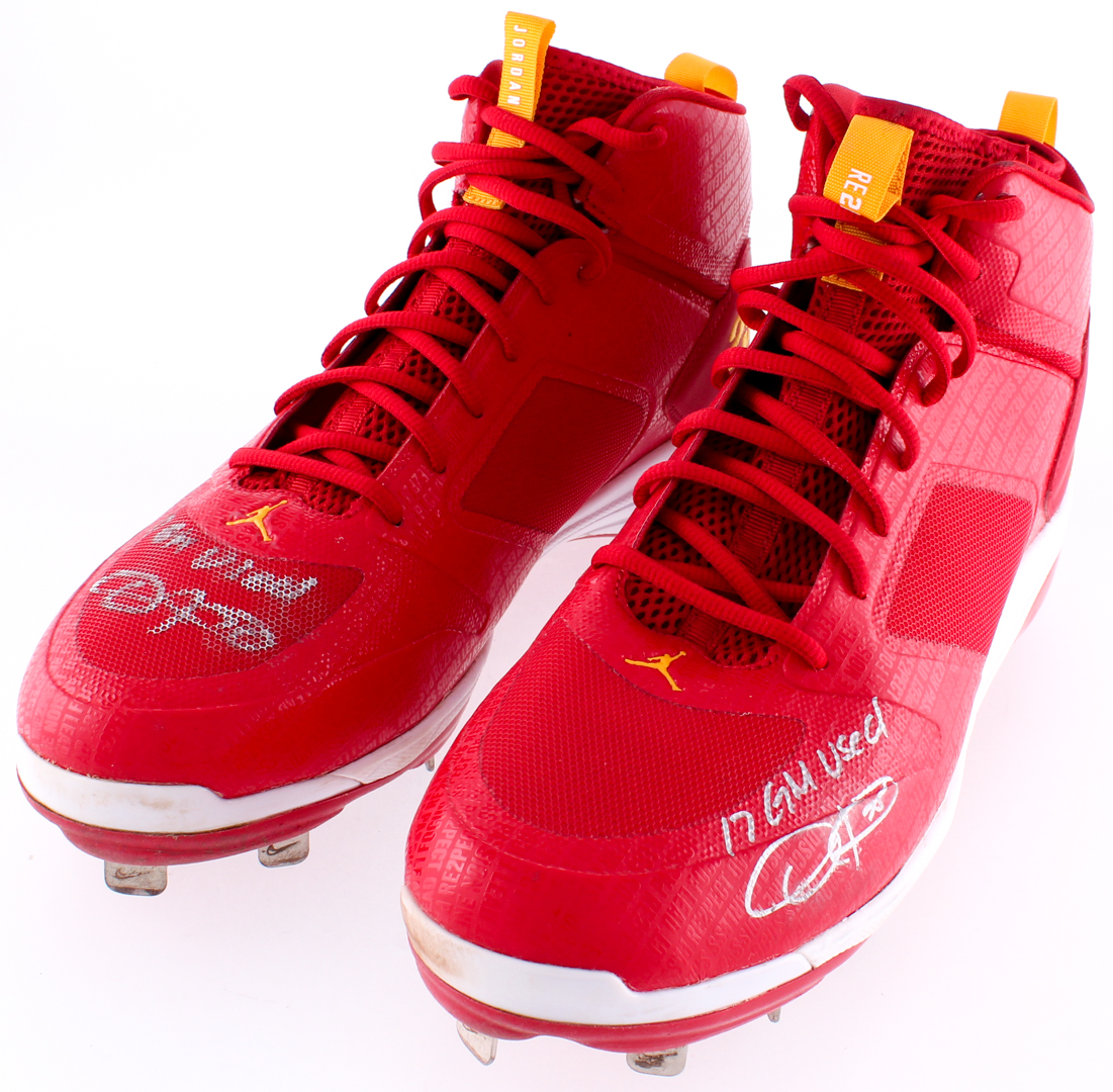 Dexter Fowler game worn pair of Jordan baseball shoes / cleats, size 13. Each shoe has been hand-signed and inscribed "17 Gm Used" in silver paint pen by Dexter Fowler.