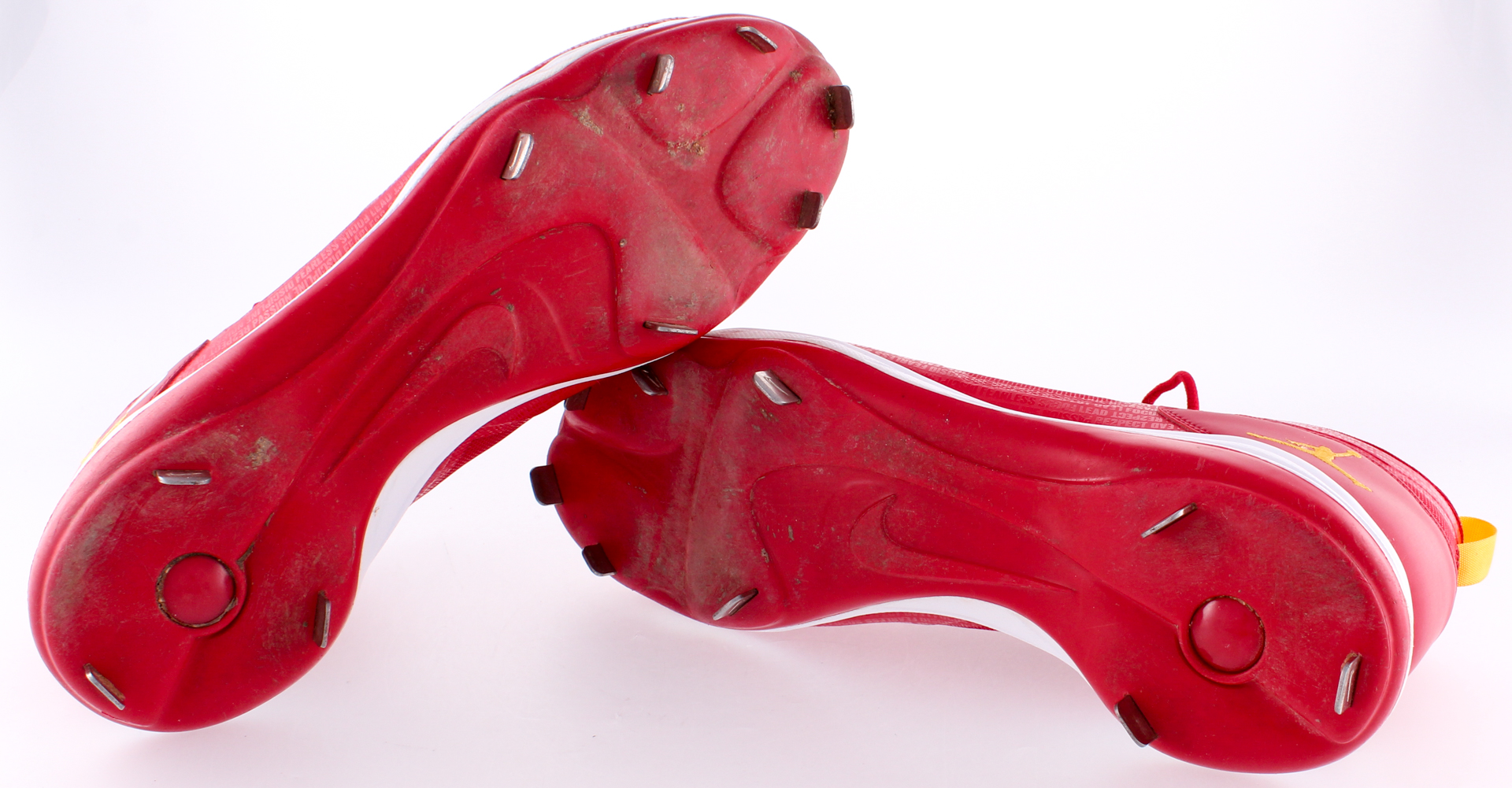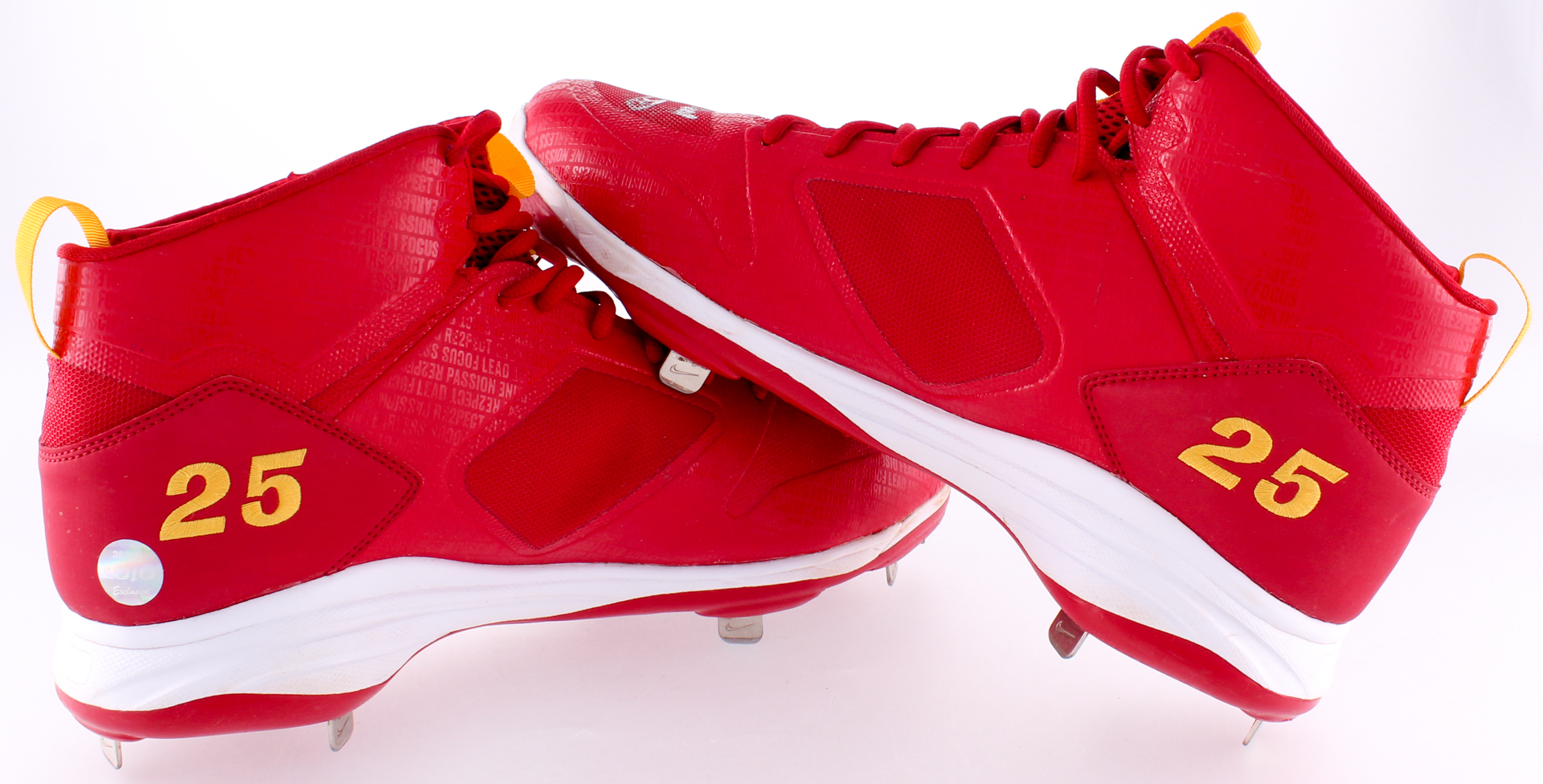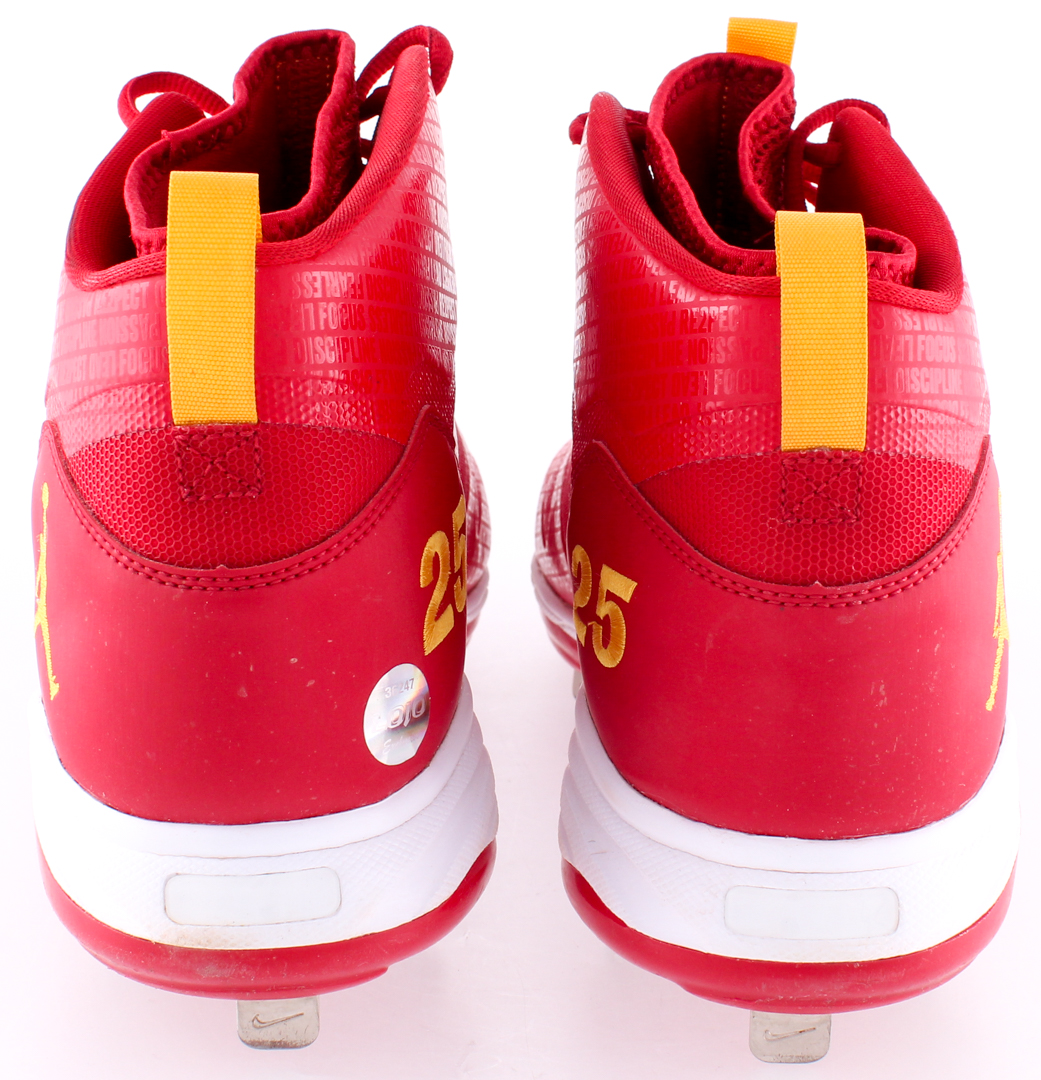 Dexter Fowler game worn pair of Jordan baseball shoes / cleats, size 13. Each shoe has been hand-signed and inscribed "17 Gm Used" in silver paint pen by Dexter Fowler.