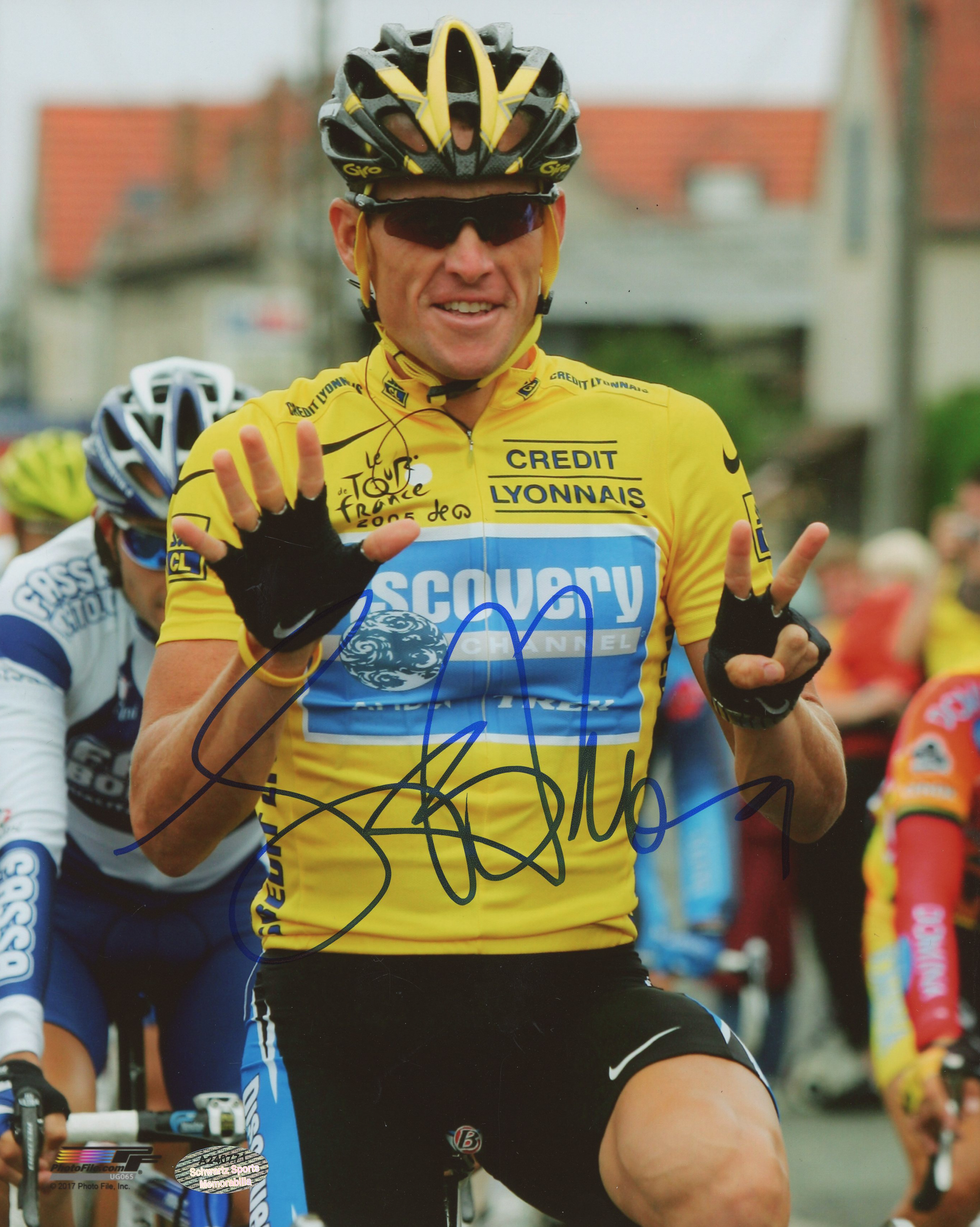 Photo measures 8" x 10" in size and has been hand-signed in blue felt-tip pen by Lance Armstrong.