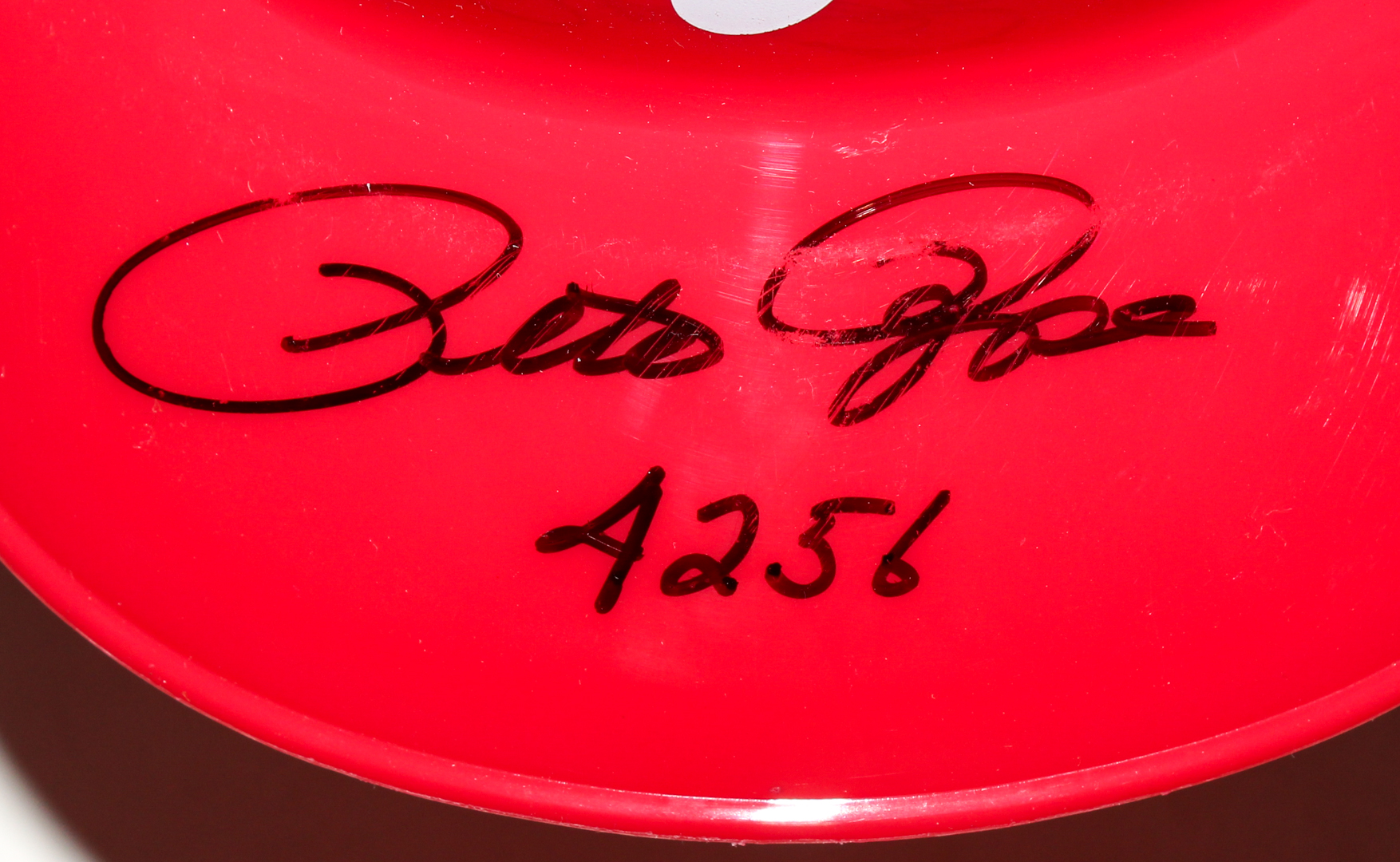 Full-size replica helmet. Hand-signed in black-felt tip pen by Pete Rose.
