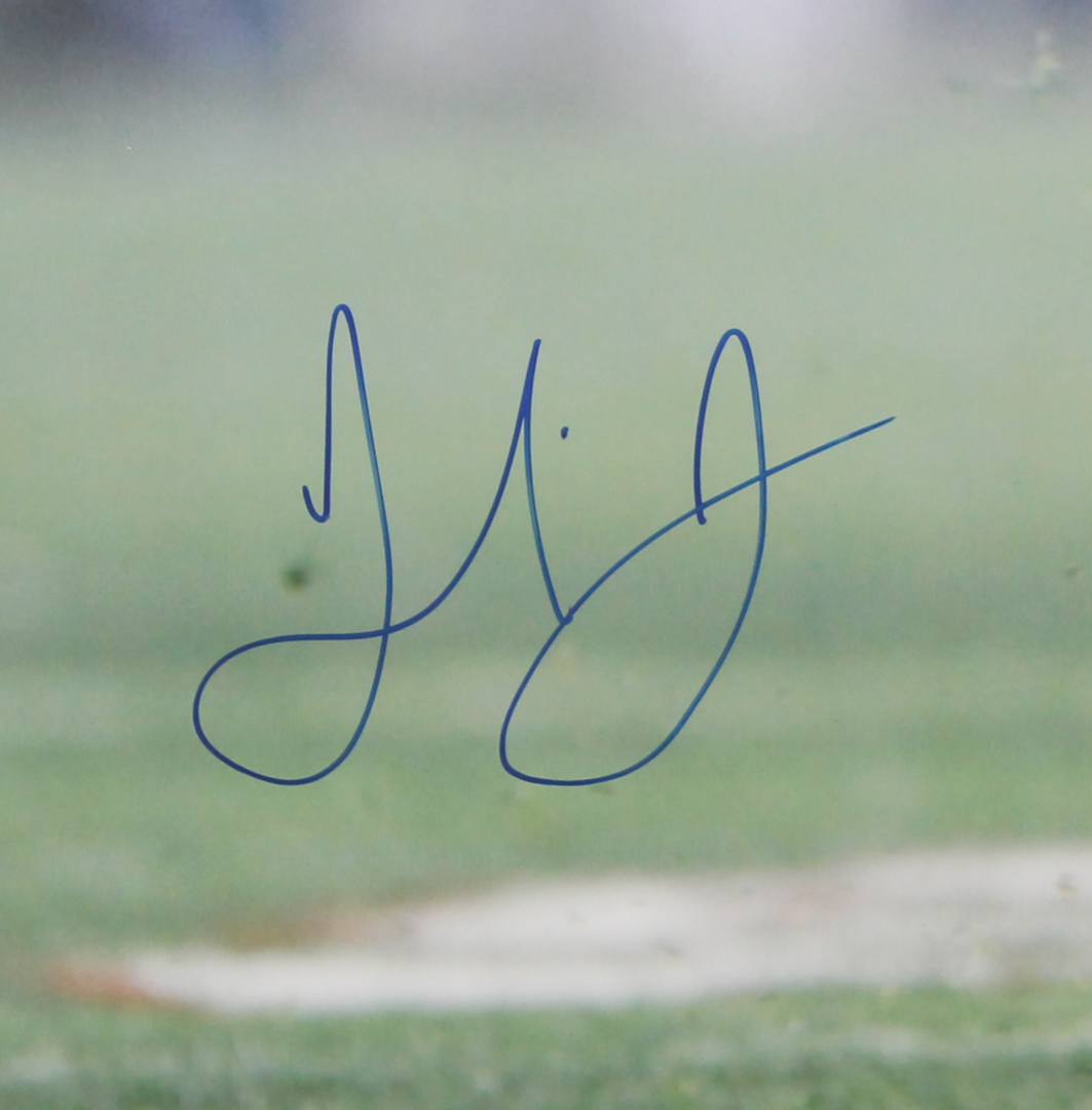Photo measures 16" x 20" in size and has been hand signed in blue felt tip pen by Julio Jones.