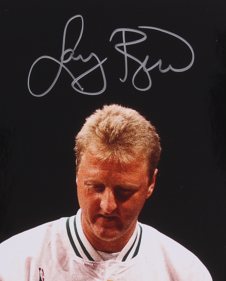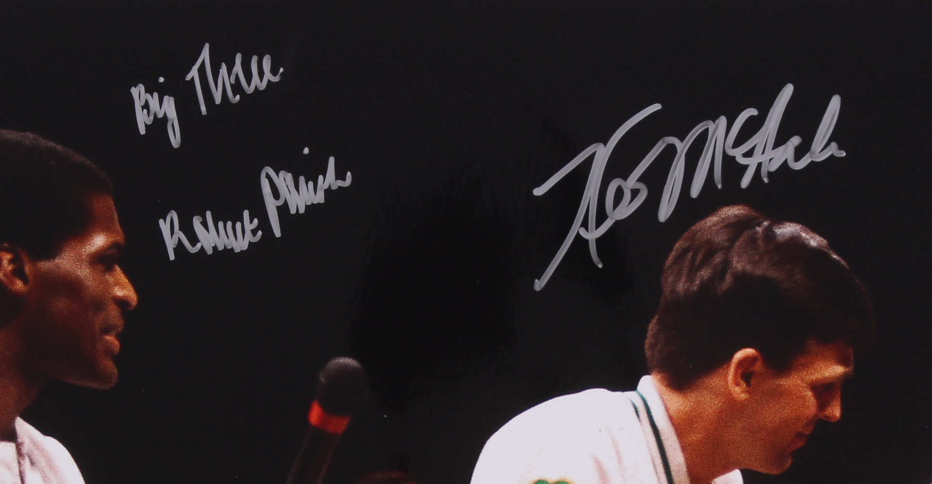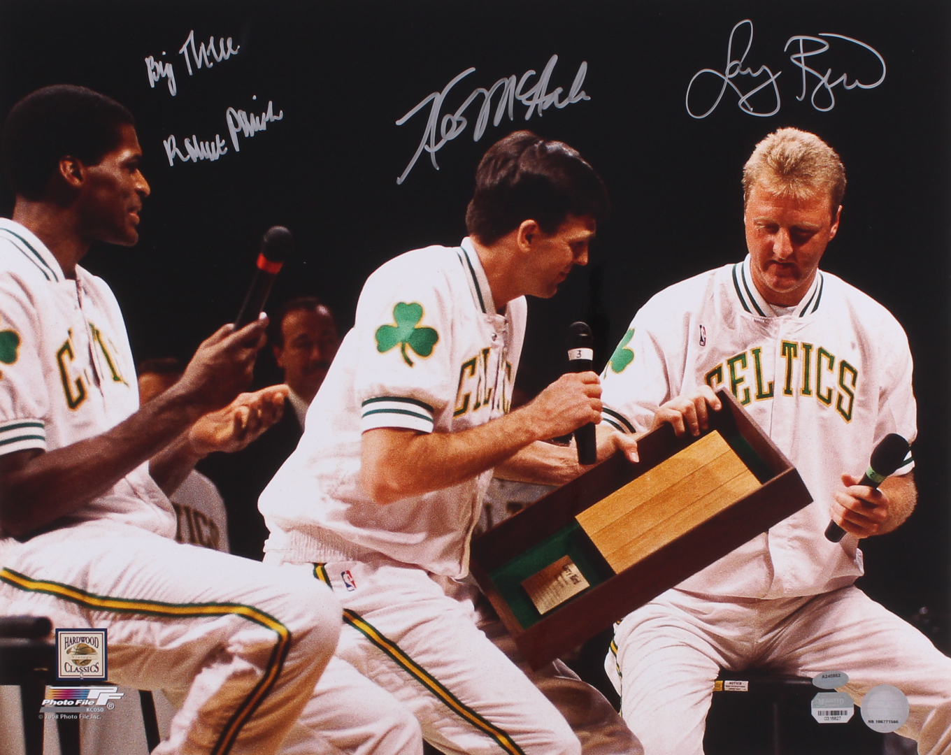 Photo measures 16" x 20" in size and has been hand-signed in silver paint pen by Larry Bird, Kevin McHale and Robert Parish.