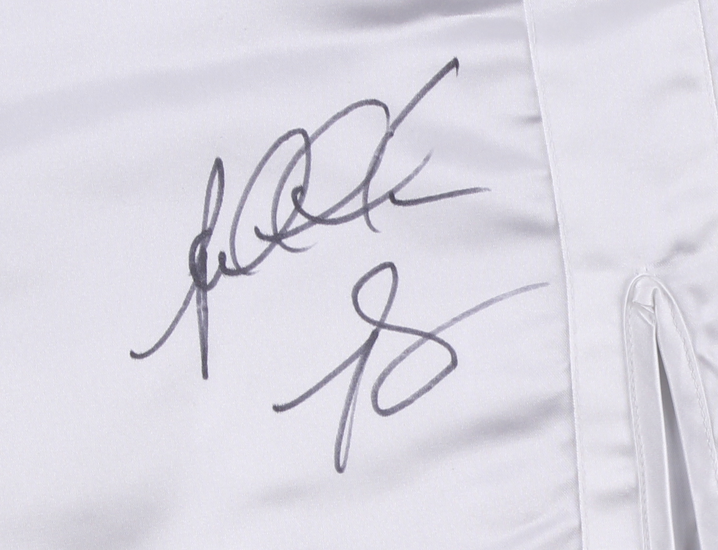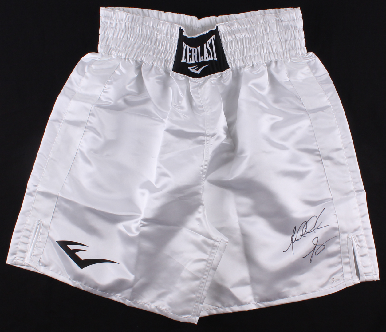 Everlast boxing shorts, size XL. Hand-signed in black felt-tip pen by Riddick Bowe.