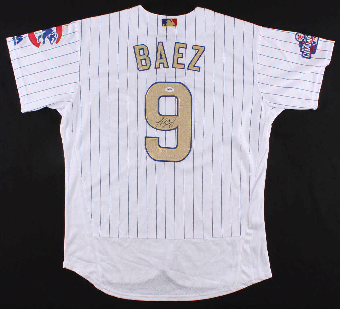 Majestic on field style jersey. Everything is sewn on, size 44. Hand-signed in black felt-tip pen by Javier Baez. Jersey includes a 2016 World Series patch on the right sleeve.