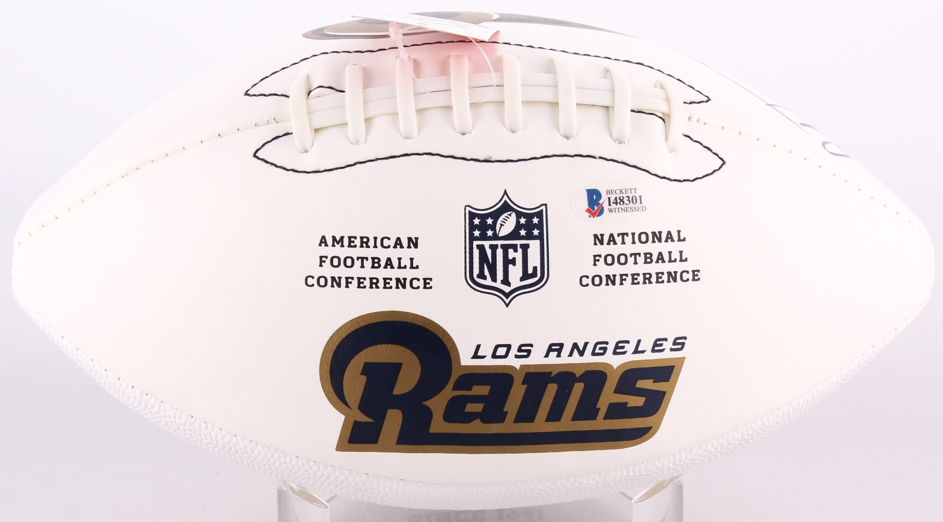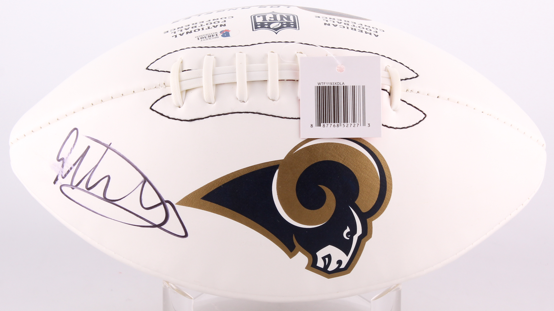 Los Angeles Rams logo football. Hand-signed in black felt-tip pen by Todd Gurley. Please note the imperfection in the signature.