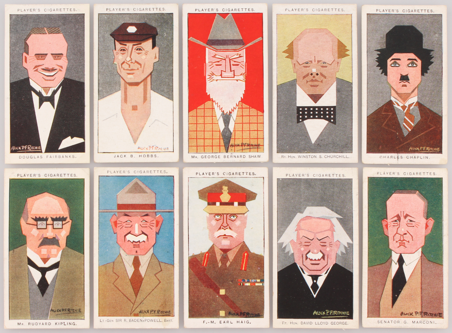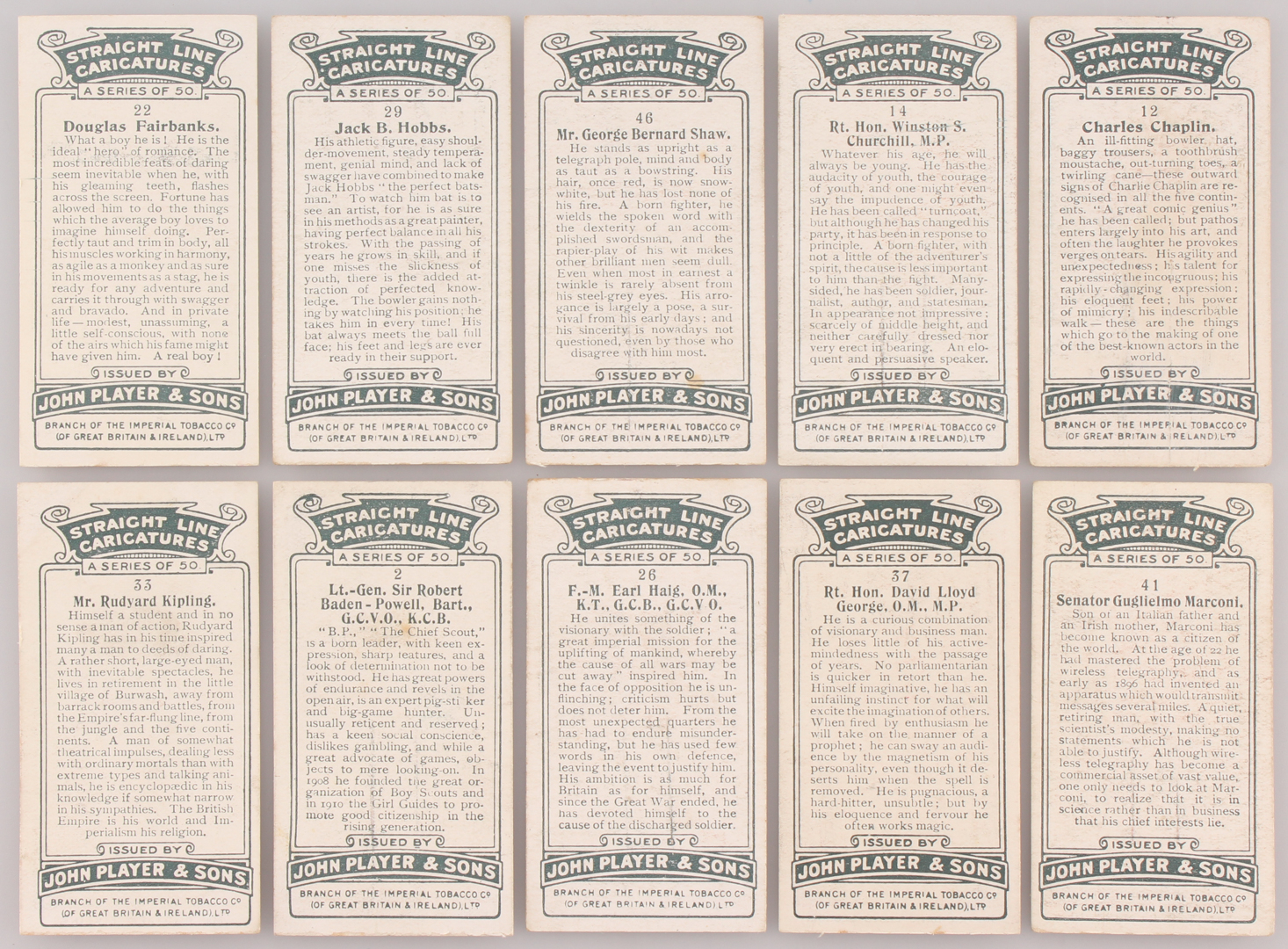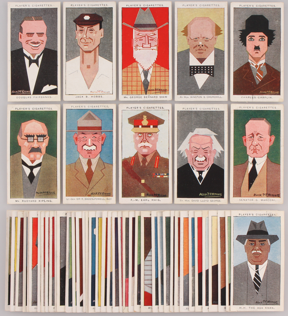 1926 Player's "Straight Line Caricatures" Complete Set of (50) Cigarette Cards With #12 Charlie Chaplin, #14 Winston Churchill, #41 Senator Guglielmo Marconi