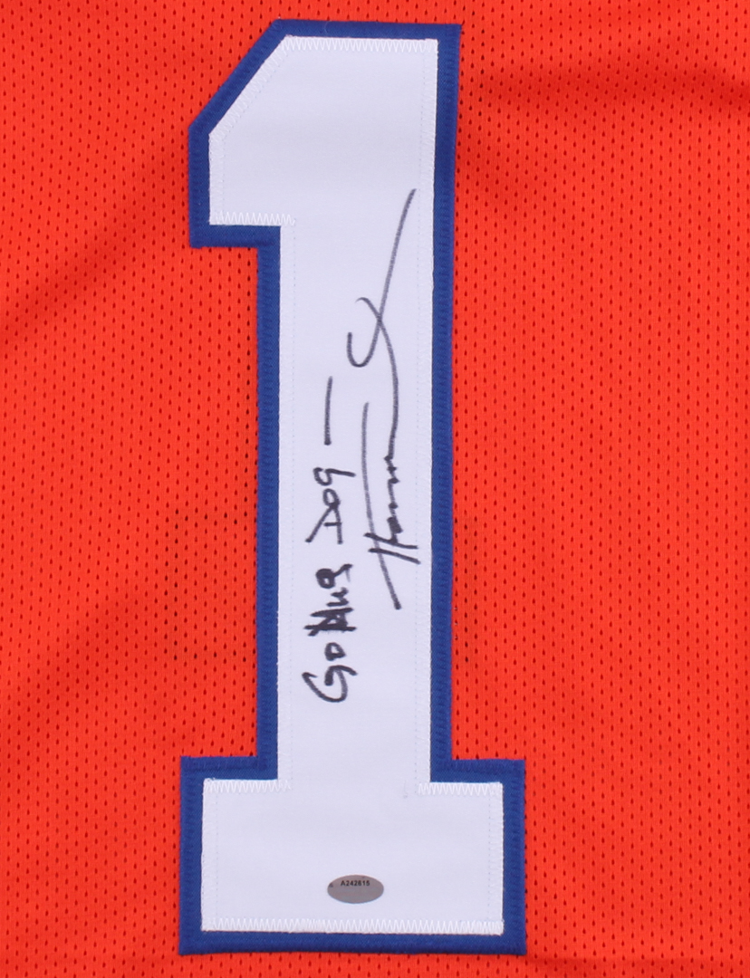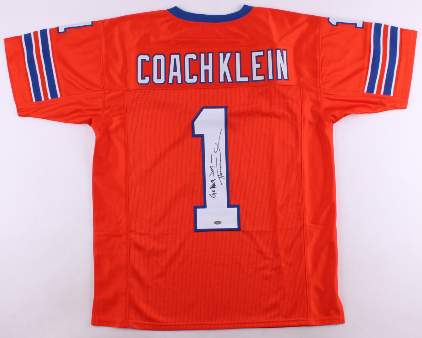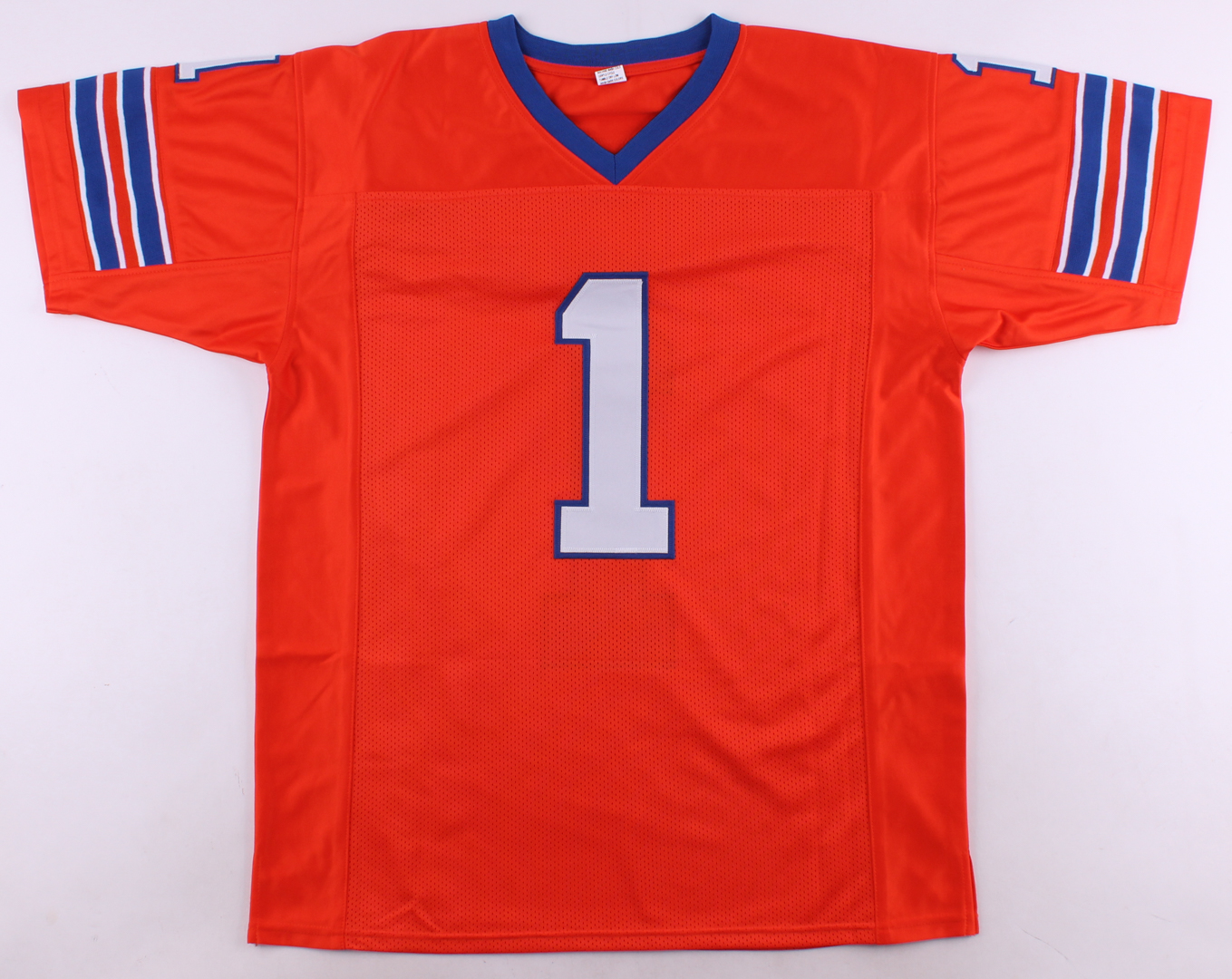 Custom on-field style orange football jersey with everything sewn on, size XL. Hand-signed in black felt-tip pen by Henry Winkler.
