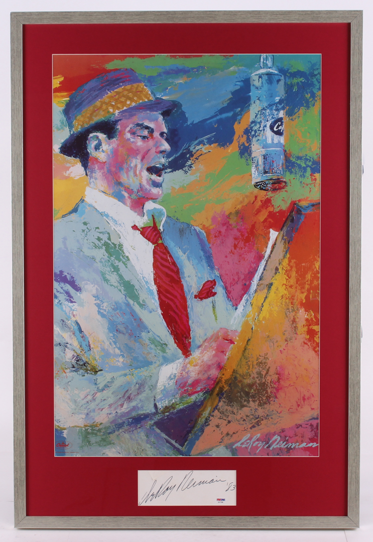 Custom framed display measures 25" x 37" in size and features a cut that has been hand-signed in black felt-tip by Leroy Neiman (D. 2012). The display includes a print of "Frank Sinatra" by Leroy Neiman with a facsimile signature.