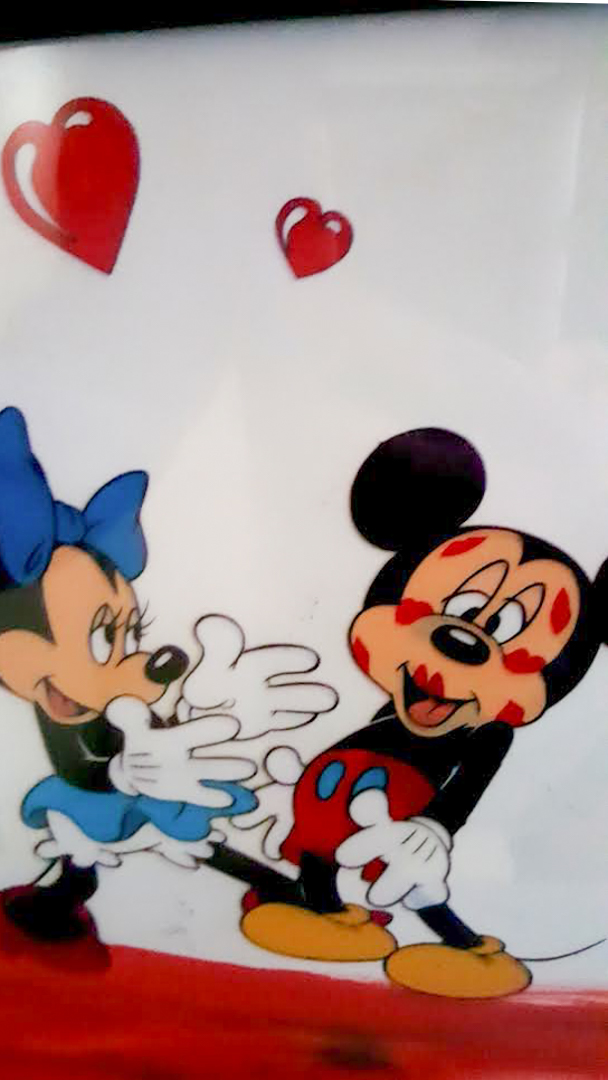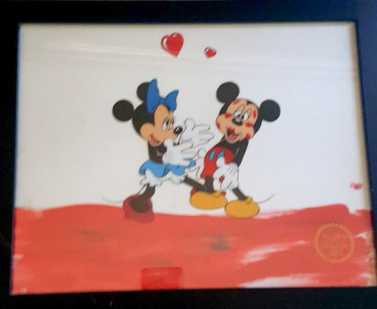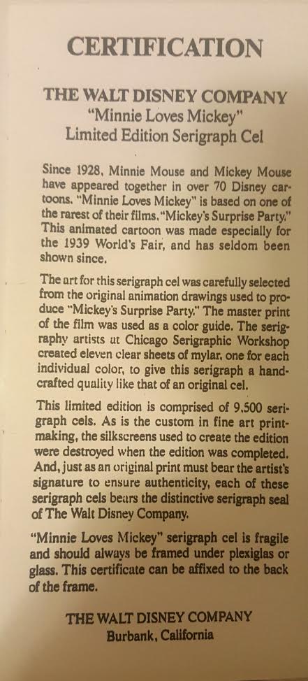 Custom Framed Disney archival measures 12" x 16" in size. Minnie Loves Mickey Limited edition piece includes an official authentication seal from Walt Disney in the lower right corner. The cel was created using the original drawings and exact color from the 1939 Disney cartoon Surprise Party. This a clear cel with a colored background.
