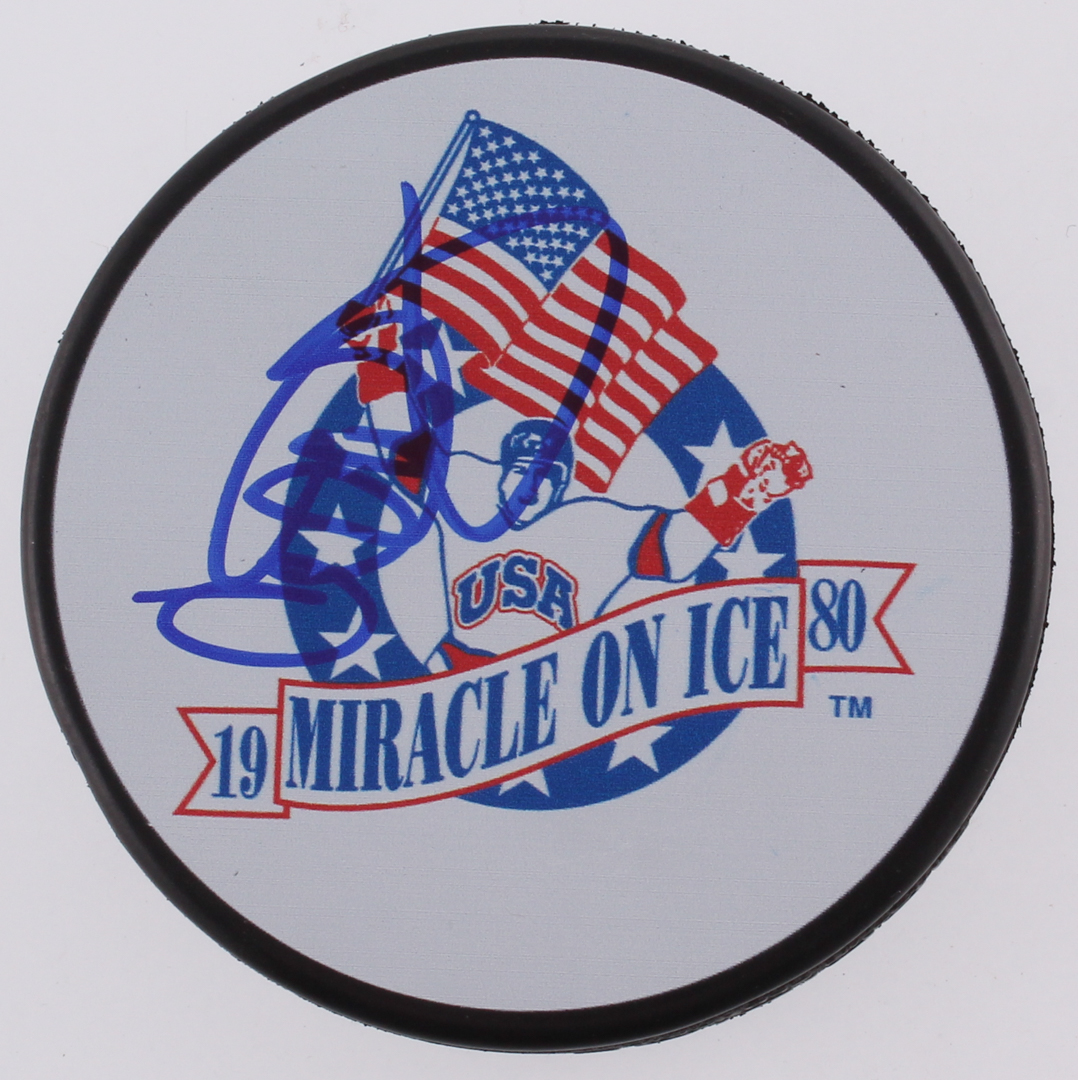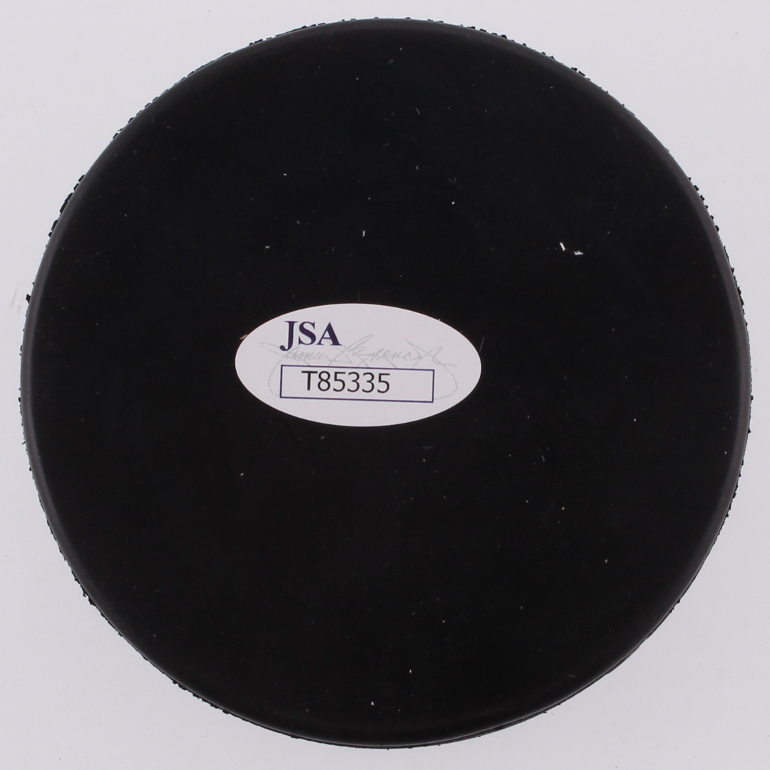 1980 Miracle on ice logo hockey puck. Hand-signed in blue felt-tip pen by Al Michaels (Sportscaster).