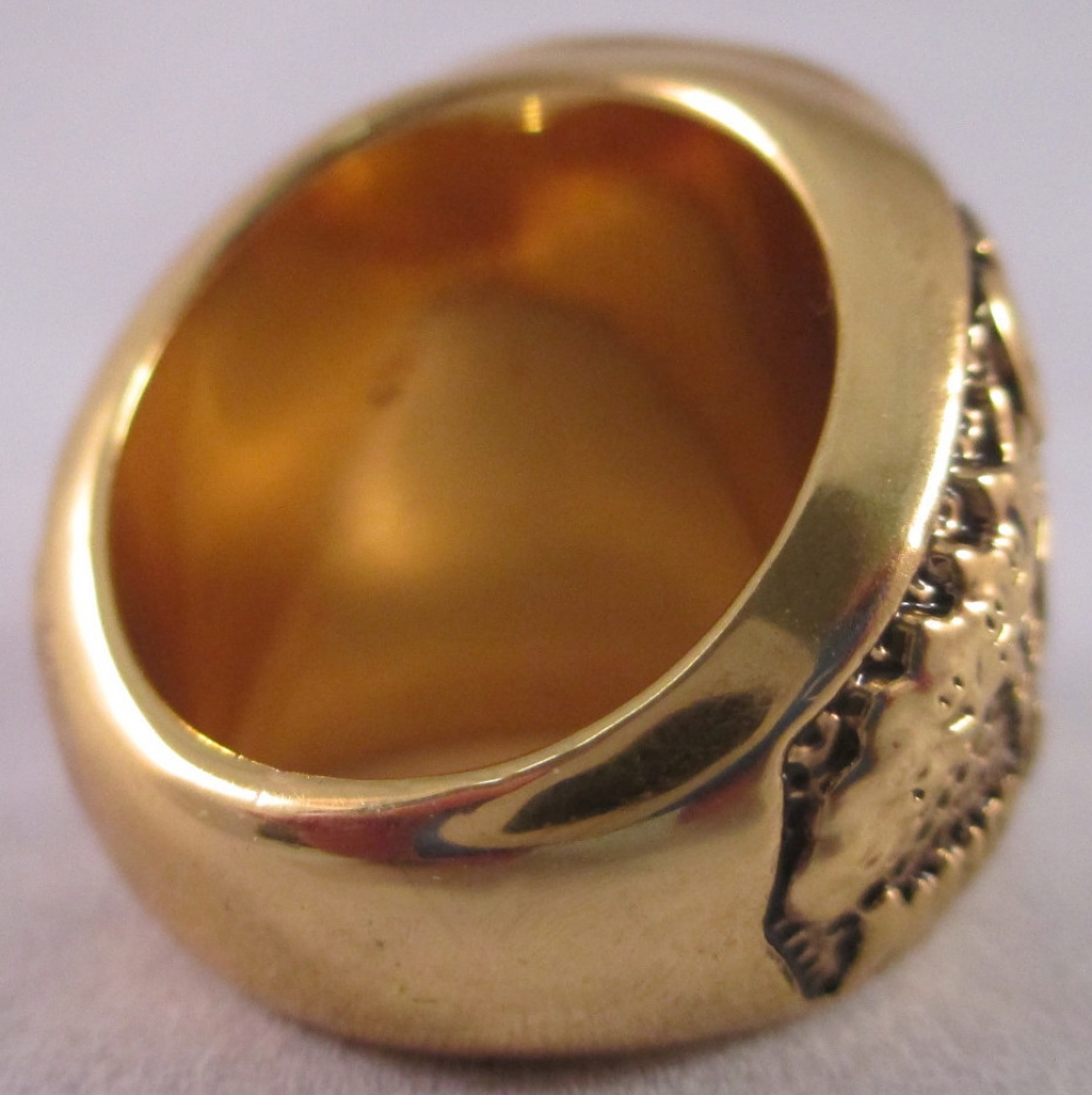 Mark Messier Edmonton Oilers 1990 Stanley Cup Champions Ring (High Quality Replica). The ring has been hand crafted by professional jewelers. Made of metal alloy and clad with 18 karat gold. Size 10.5. The ring weighs 84 grams.