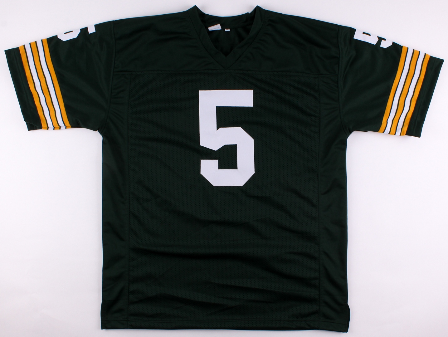 Custom on-field style jersey. Everything sewn on, size XL. Hand-signed in black felt-tip pen by Paul Hornung (HOF).