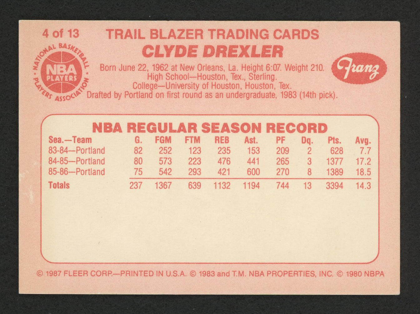 1986-87 Franz Portland Trail Blazers #4 Clyde Drexler