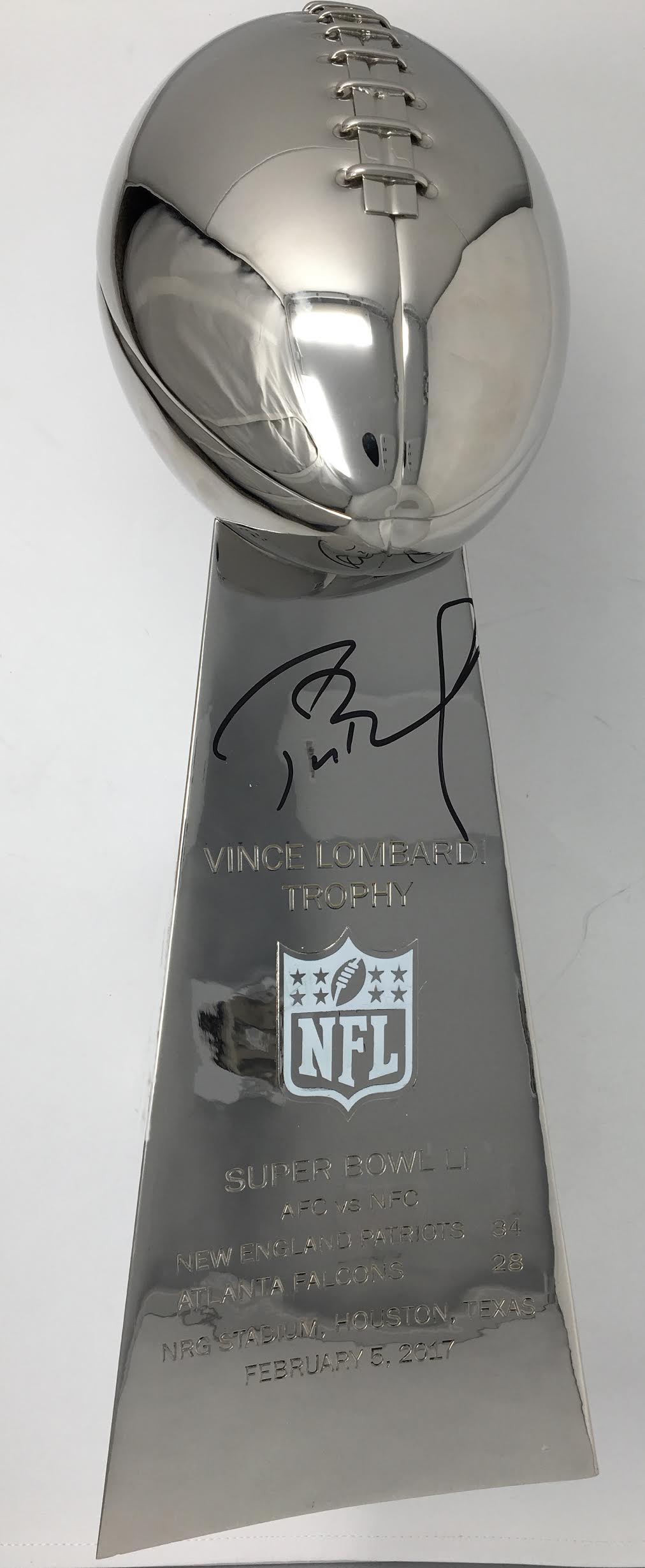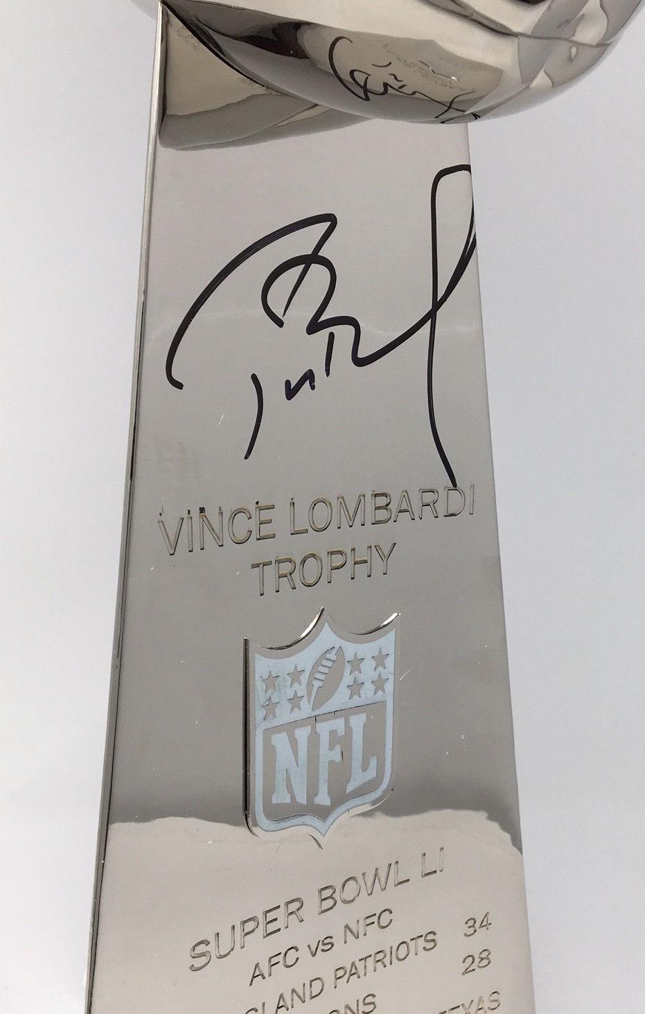 Replica Super Bowl 51 Lombardi trophy measures approximately 21" in height and weighs approximately 15 pounds. Hand signed in black felt-tip pen by Tom Brady (Patriots). The trophy is a limited edition and has been hand-numbered #6/12.