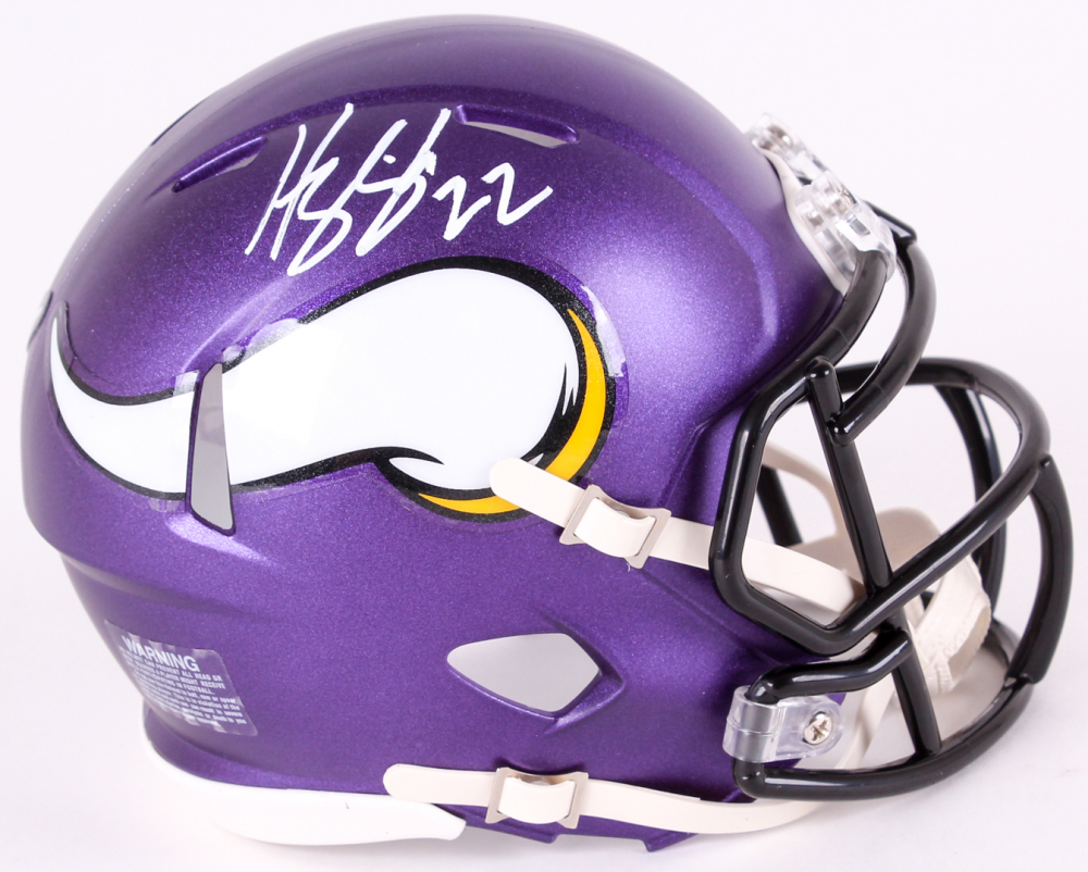 Minnesota Vikings mini speed helmet. Hand-signed in white paint pen by Harrison Smith.