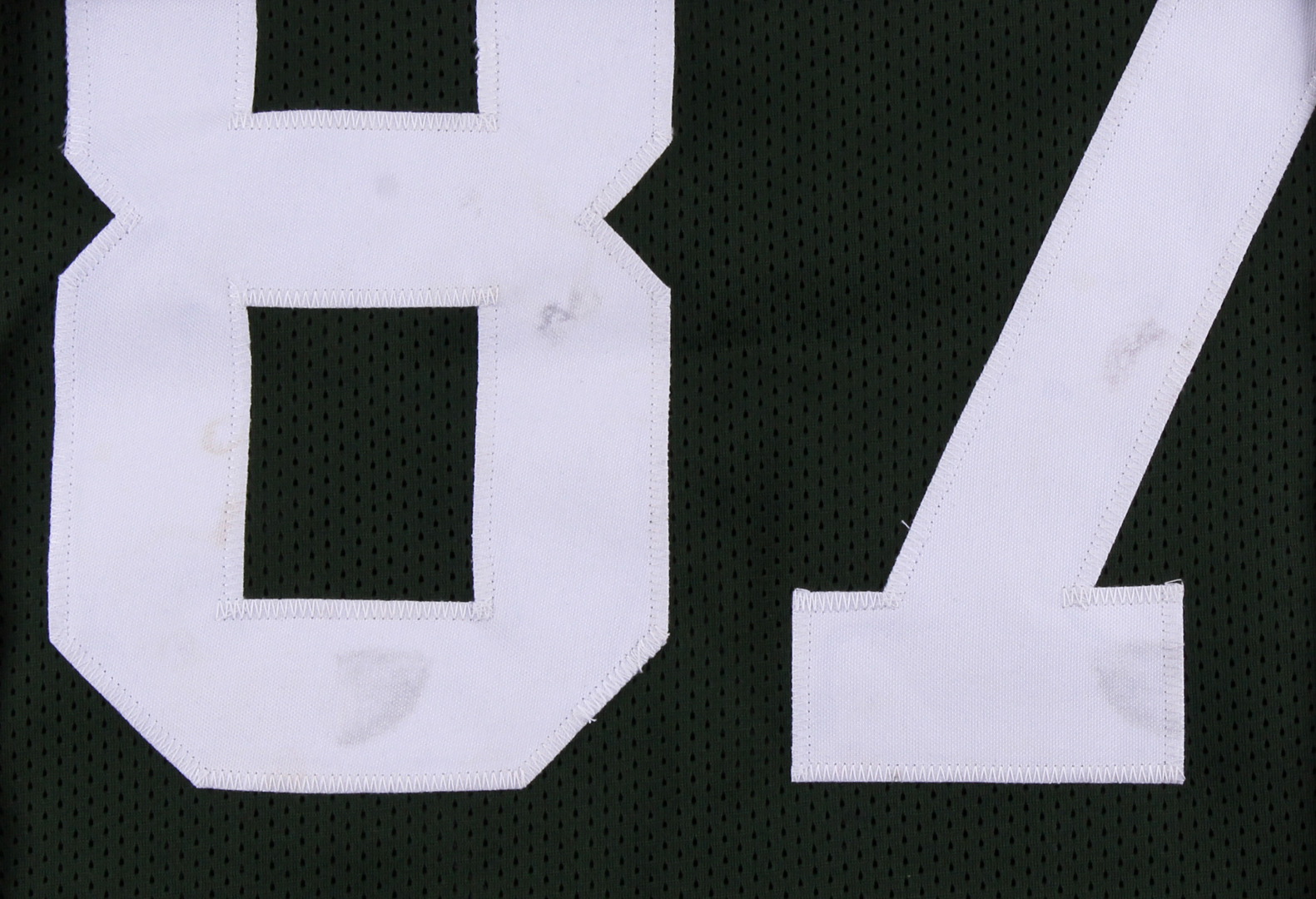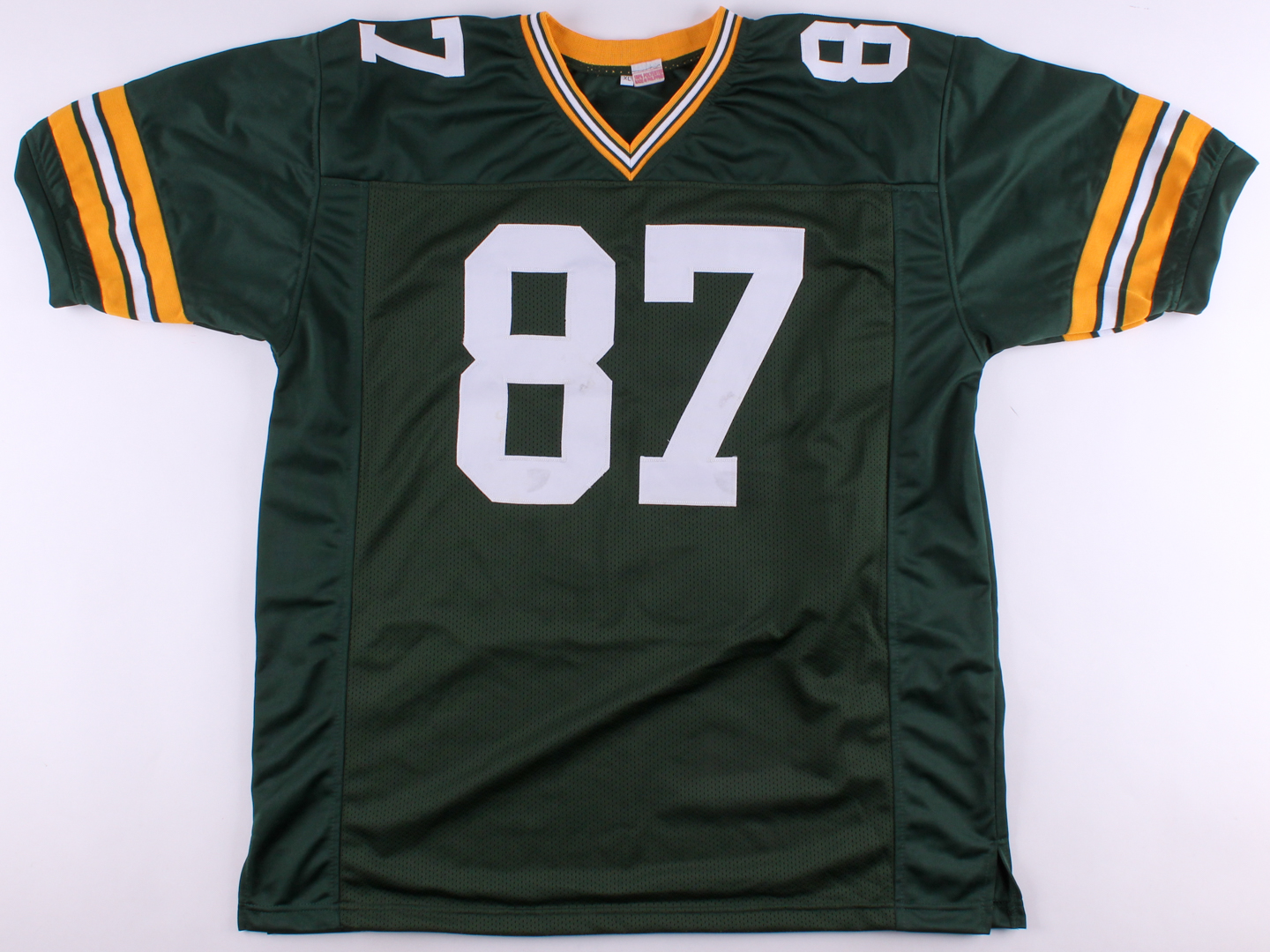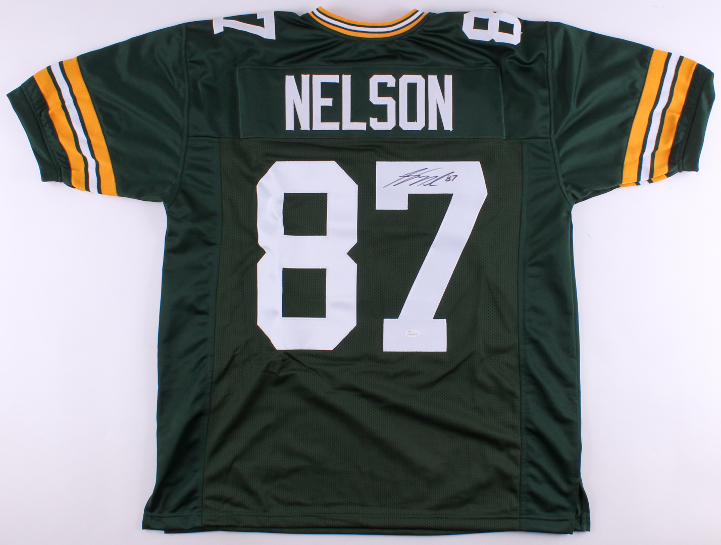 Custom on-field style jersey. Everything is sewn on, size XL. Hand-signed in black felt-tip pen Jordy Nelson. Please note the jersey has minor staining, but once framed the stains will not be noticeable.