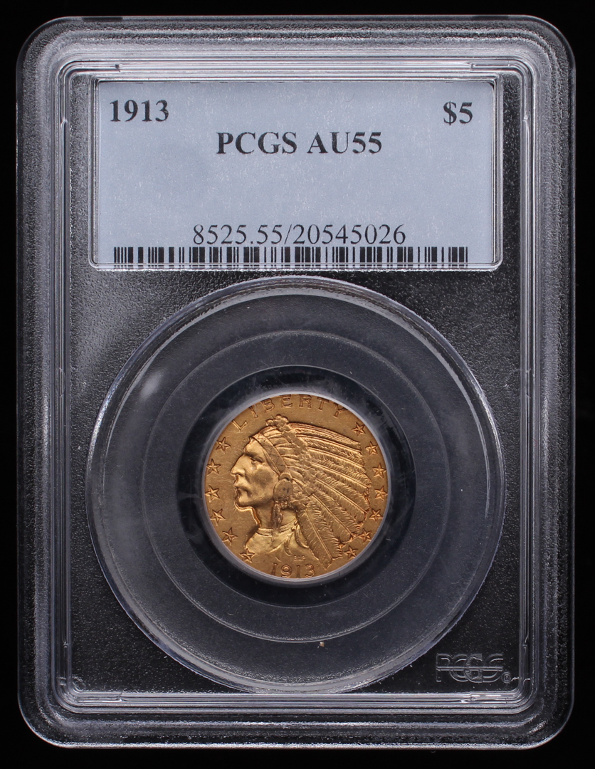 1913 $5 Indian Head Half Eagle Gold Coin (PCGS AU 55)