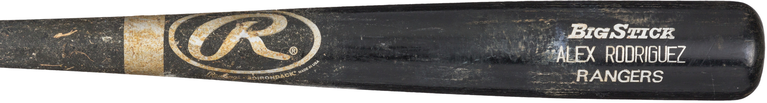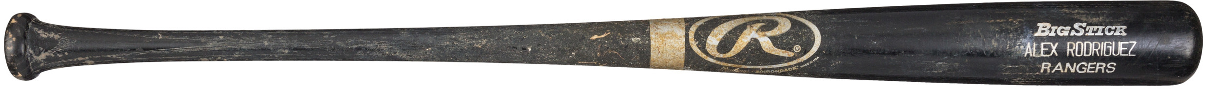 Rawlings Big Stick baseball bat game-used by Alex Rodriguez during his 2001 MLB season with the Texas Rangers. The bat shows heavy use and remains un-cracked.