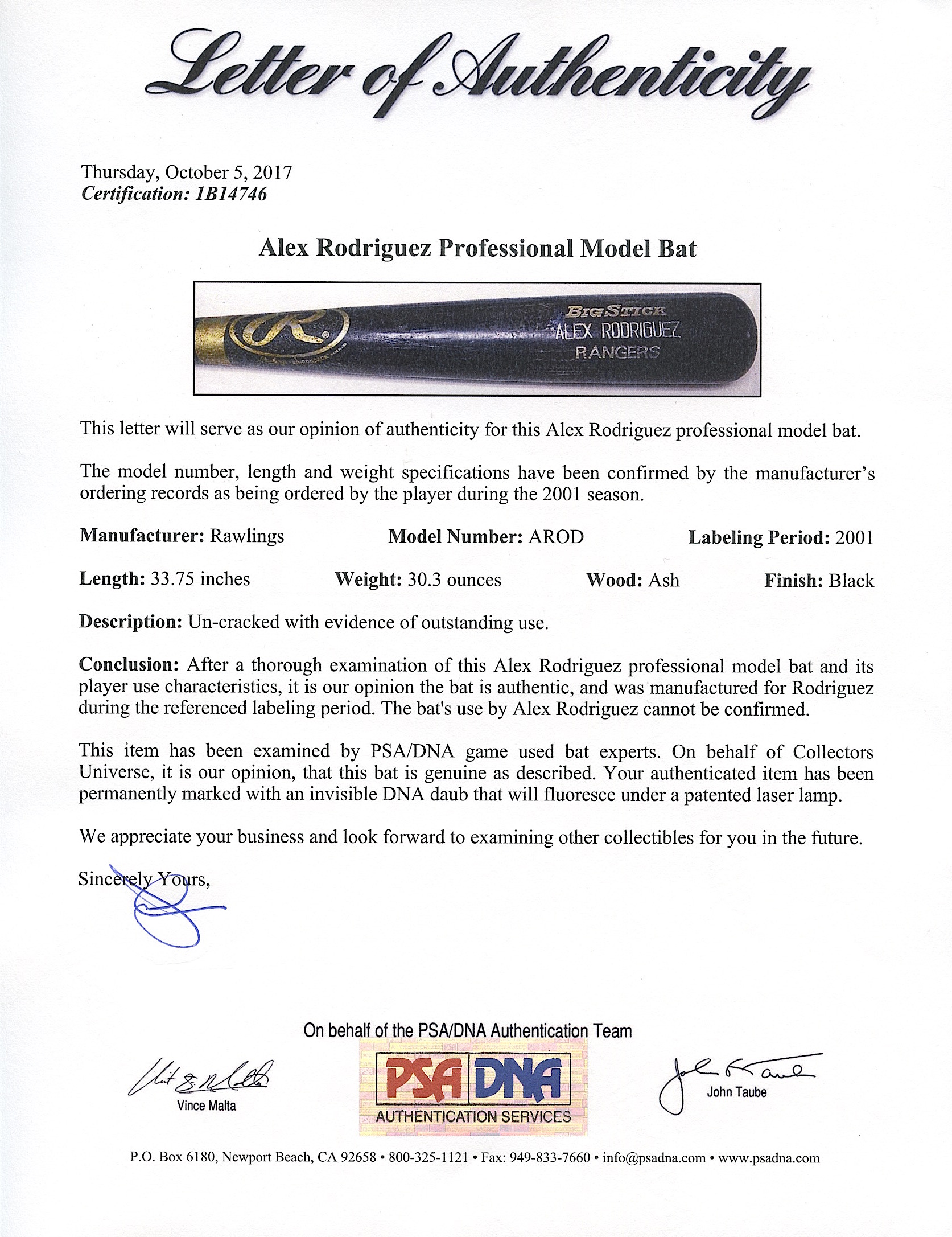 As stated in the PSA/DNA LOA, "after a thorough examination of this Alex Rodriguez professional model bat and its player use characteristics, it is our opinion the bat is authentic, and was manufactured for Rodriguez during the referenced labeling period."