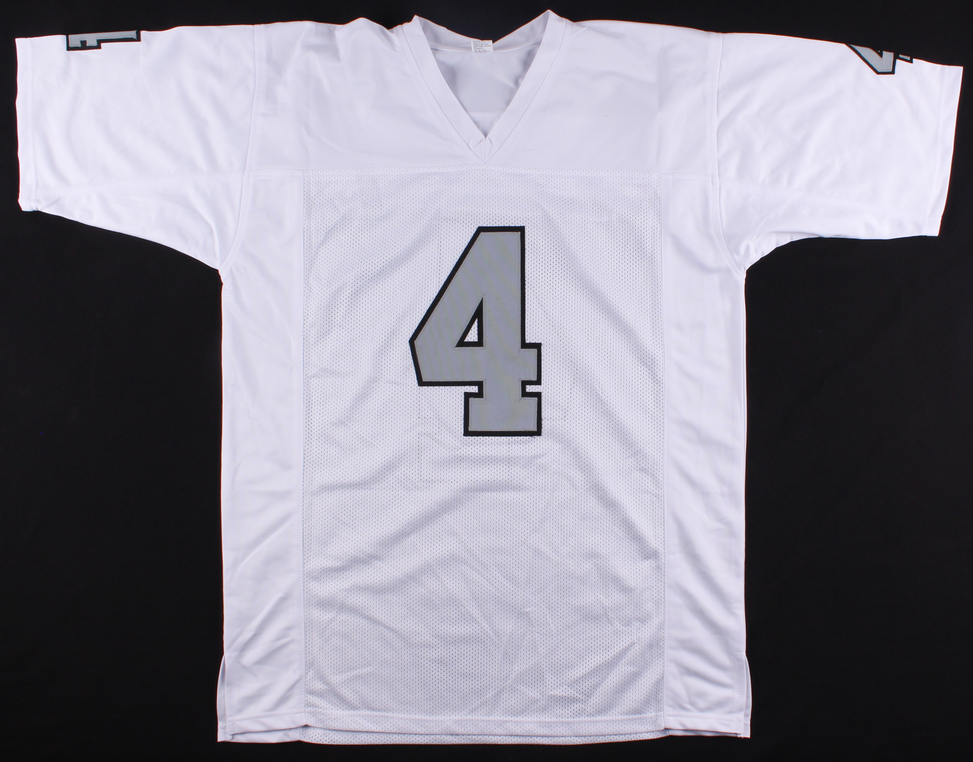 Custom on-field style jersey, Size XL. Everything is sewn on. Hand-signed in black felt-tip pen by Derek Carr.