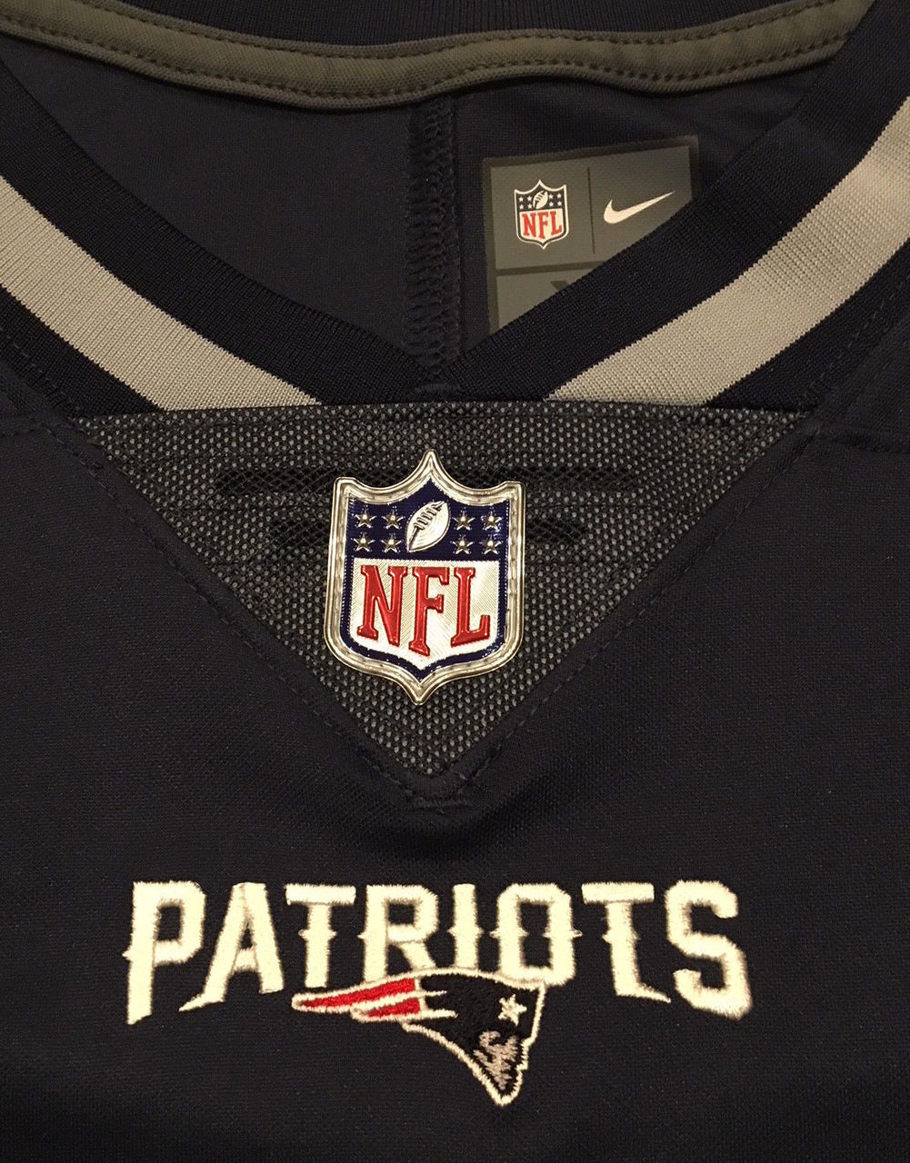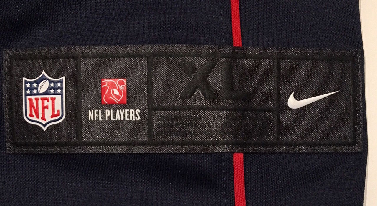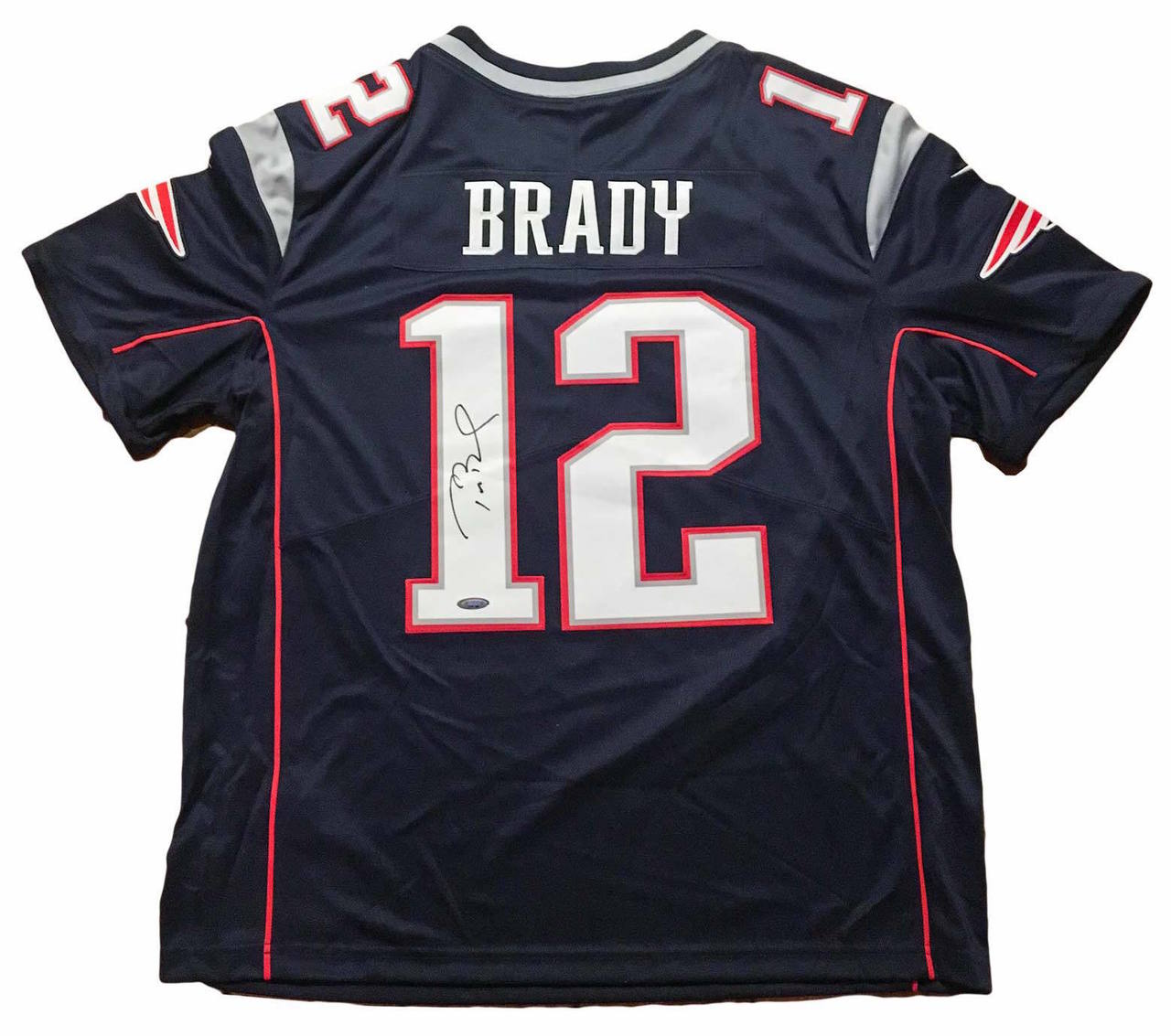 Nike authentic on-field jersey. Everything is sewn on, size XL. Hand-signed in black felt tip pen by Tom Brady.